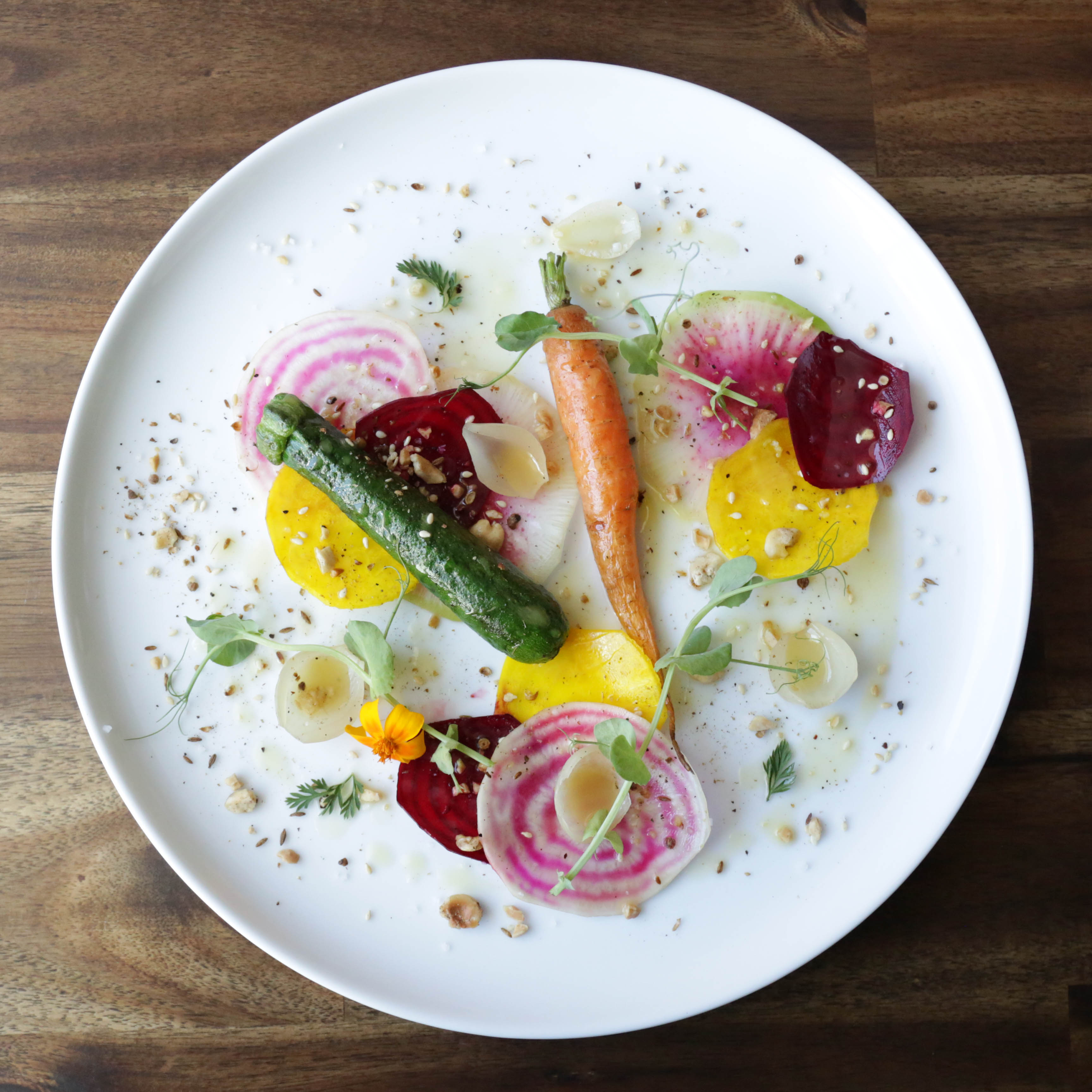 Marie-Anne Bédard, alias Madame La Chef, est appelée à sortir de sa cuisine régulièrement, non seulement pour aller à la rencontre des clients, mais aussi – et surtout – pour créer de vraies œuvres d’art comestibles. Que ce soit pour la Frénésie du jardin (des légumes croquants agrémentés d’une vinaigrette de caméline et de dukkah disposés un à un dans l’assiette devant nos yeux), un plat nommé Mon beau maquereau (cuit à la table à la torche) ou le Chef d’œuvre (un dessert incroyable dressé directement sur la table), elle multiplie les apparitions en salle, et c’est là toute l’originalité du concept.