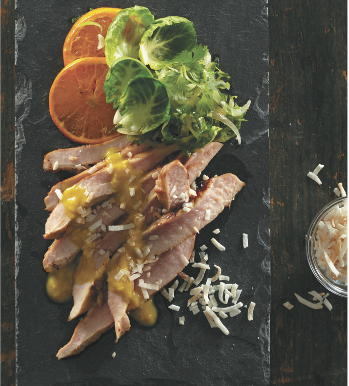 La chef gastronomique de L’Eau à la bouche, Anne Desjardins, a livré dans le livre Le cochon de la tête à la queue sa recette de bavette de porc à la coriandre et à la noix de coco, sauté de choux de Bruxelles à la clémentine.