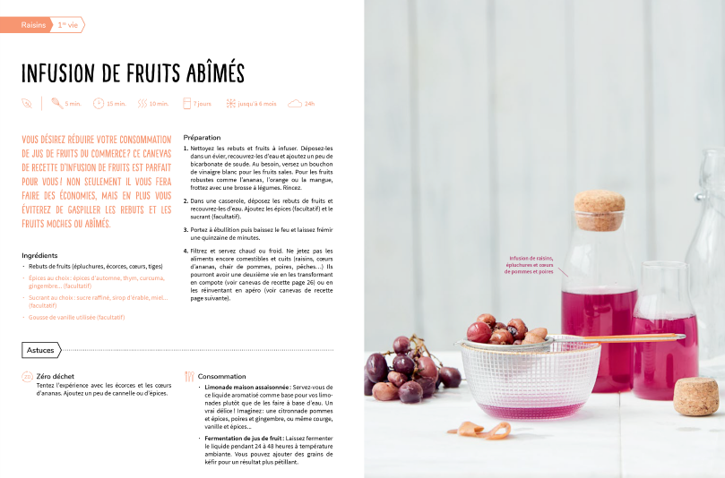 Florence-Léa Siry suggère aussi une surprenante recette d’infusion faite de fruits abîmés et d’épluchures. «On pense plus souvent à adopter l’approche zéro gaspillage en cuisinant son propre bouillon à partir de légumes, mais on peut aussi en faire une version sucrée avec les restes de fruits, explique-t-elle. On peut ensuite le boire chaud, comme une infusion, ou froid – ça remplace bien le jus. On peut aussi faire une limonade à partir de ce liquide aromatisé.»