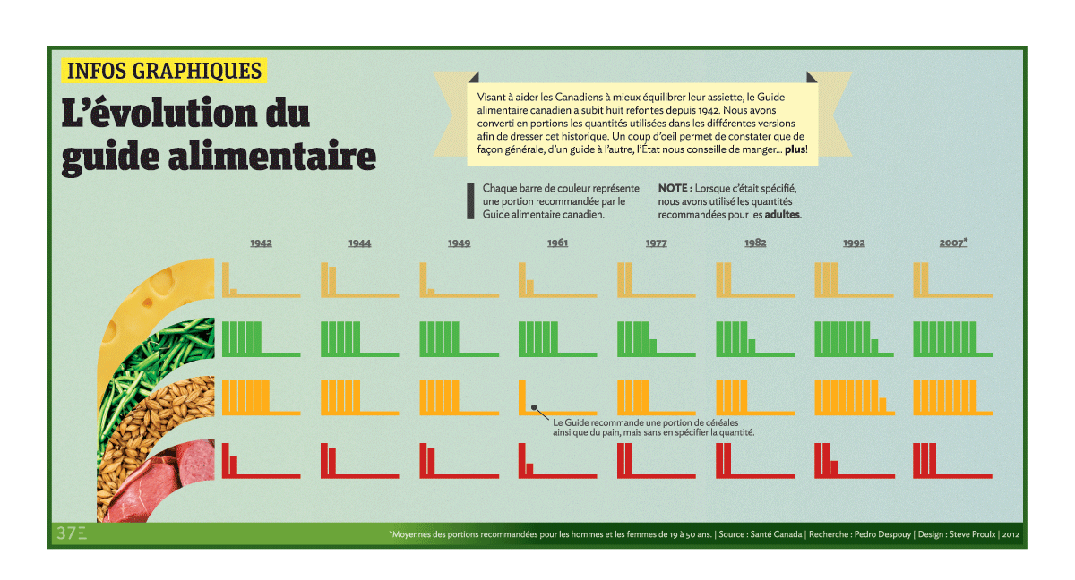 Visant à aider les Canadiens à mieux équilibrer leur assiette, le Guide alimentaire canadien a subi huit refontes depuis 1942. Nous avons converti en portions les quantités utilisées dans les différentes versions afin de dresser cet historique. Un coup d’œil permet de constater que de façon générale, d’un guide à l’autre, l’État nous conseille de manger… plus!