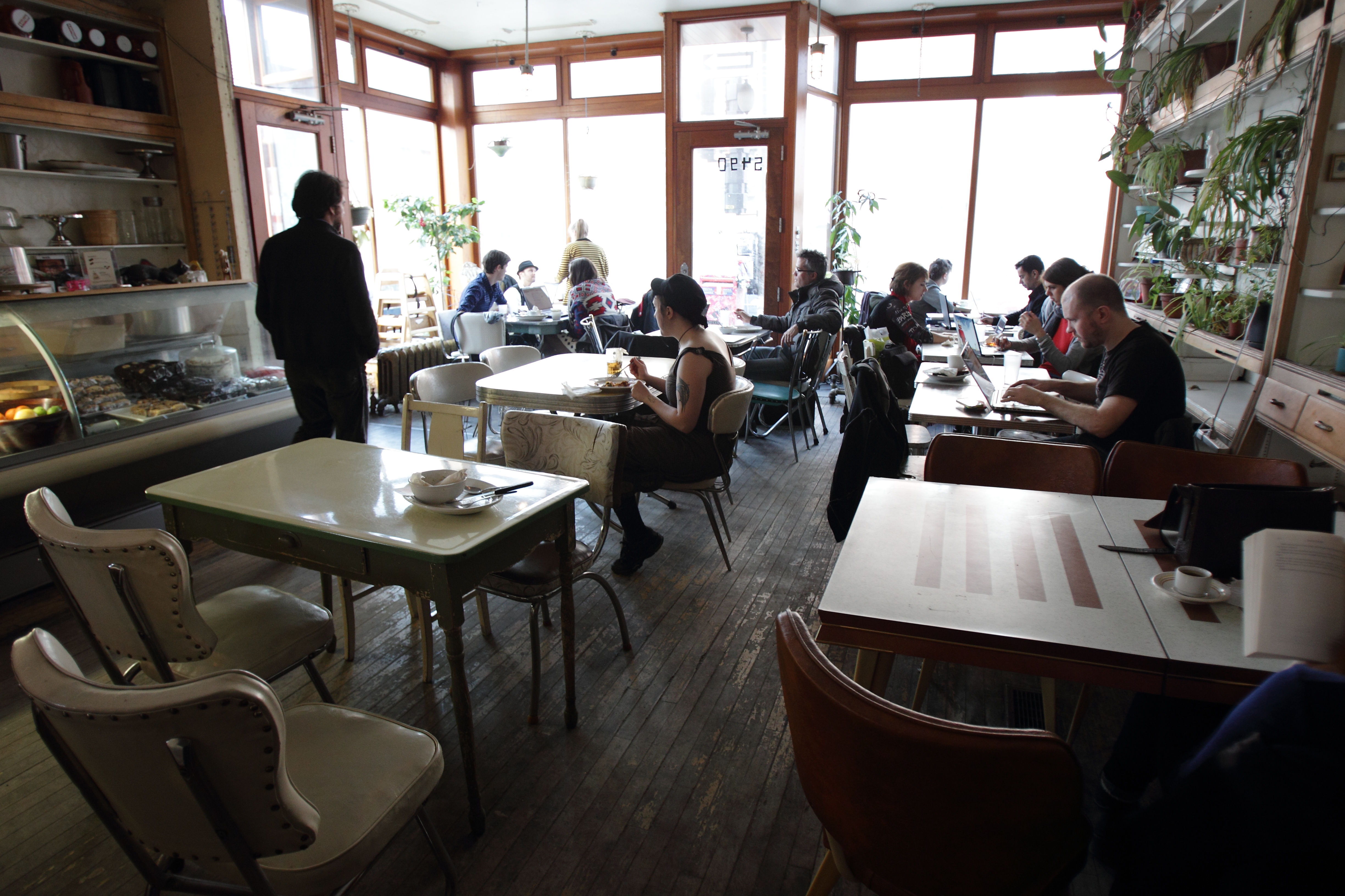 Le repaire parfait pour travailler? Lumineux. Les places près de la fenêtre sont toujours occupées! Grand. Exit les petits cafés cute et design qui n’offrent que des petits bouts de table. Accueillant. On cherche un lieu stimulant (avec une musique adéquate), où on ne se sentira pas mal de rester tout l’après-midi. Finalement, on veut un accès gratuit à l’internet – presque acquis maintenant à Montréal –, du bon café et de la bonne bouffe, histoire de tenir toute la journée.