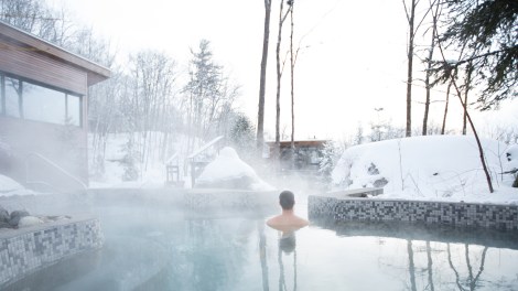 Entouré d’arbres et de gros rochers, cet espace de détente offre une tranquillité et un dépaysement sans pareils. Ses bains tourbillons extérieurs, son bain de vapeur, son sauna sec, ses chutes et bassins nordiques creusés à flanc de montagne, ainsi que ses aires de détente au cœur de la forêt en font une escapade incontournable, à seulement une heure de Montréal.