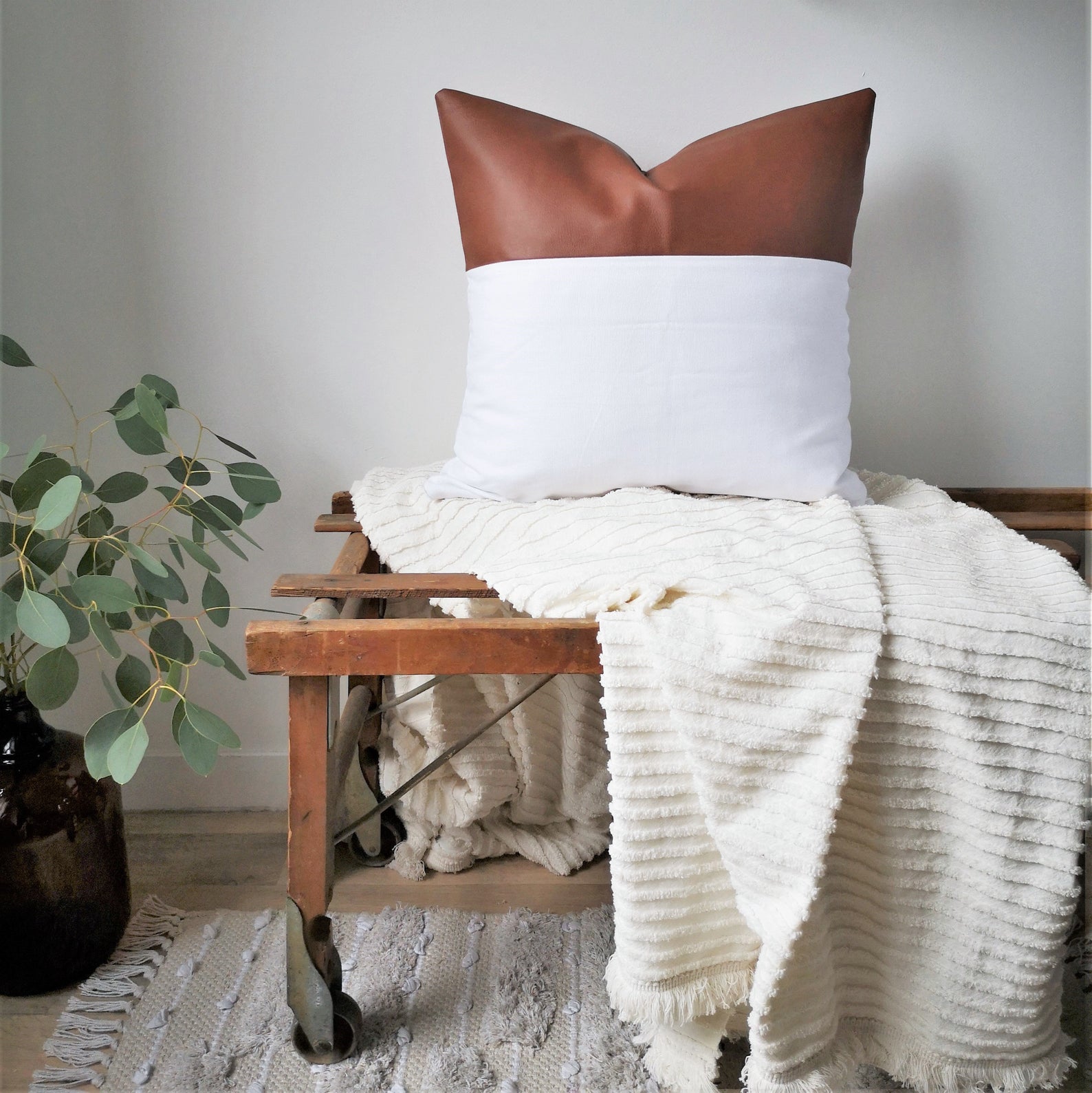 De la collection Boho, cette housse de coussin carré est faite de coton blanc et de cuirette couleur cognac. Possibilité d’acheter la housse seule ou rembourrée. Fait à la main à Québec.