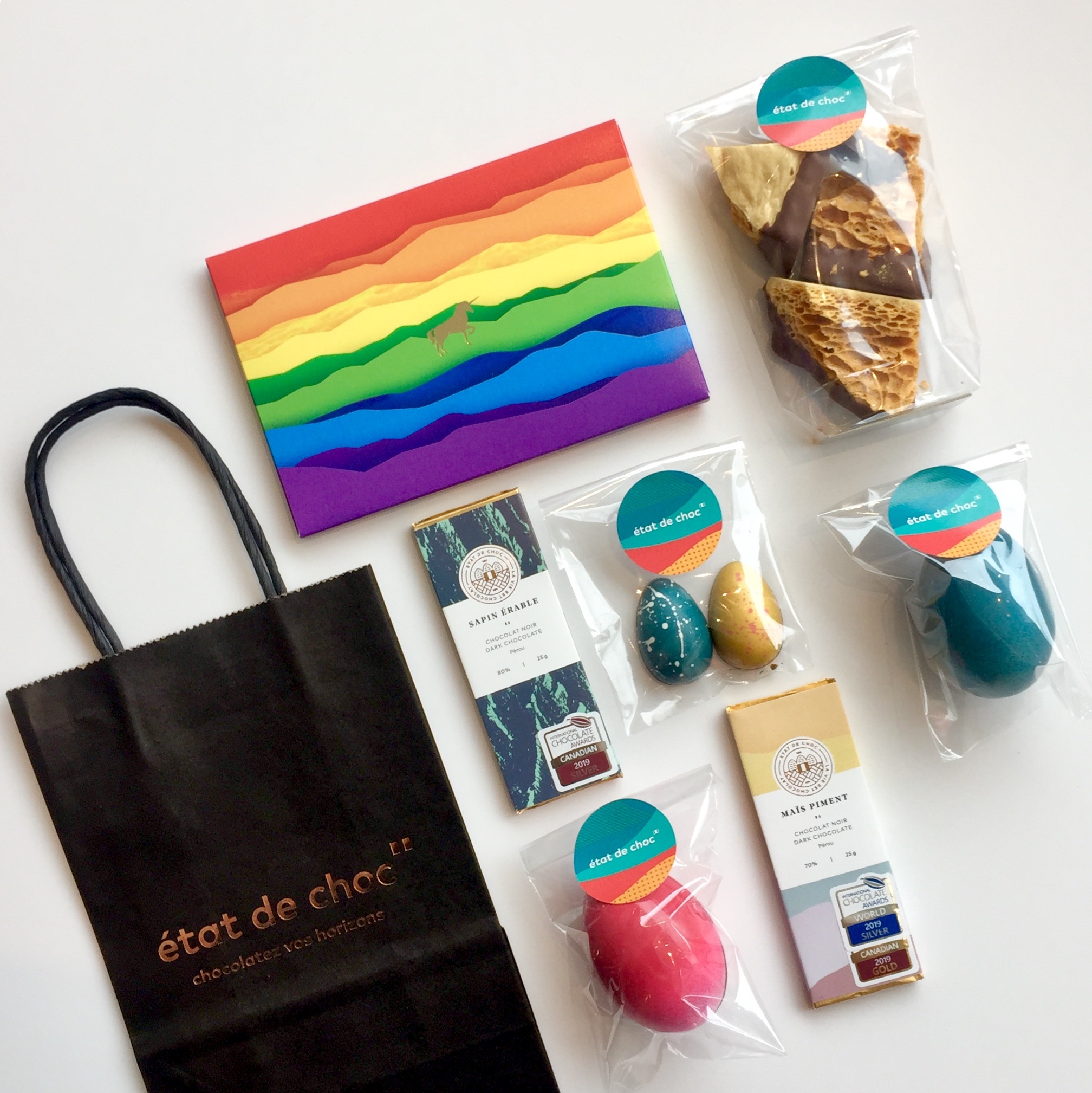 On adore le «Sac Pâques, Ça va bien aller» créé spécialement pour l’occasion. Il contient des oeufs en chocolat, de la tire éponge, deux mini-tablettes (maïs piment et sapin érable) et une carte arc-en-ciel fruit de la passion.