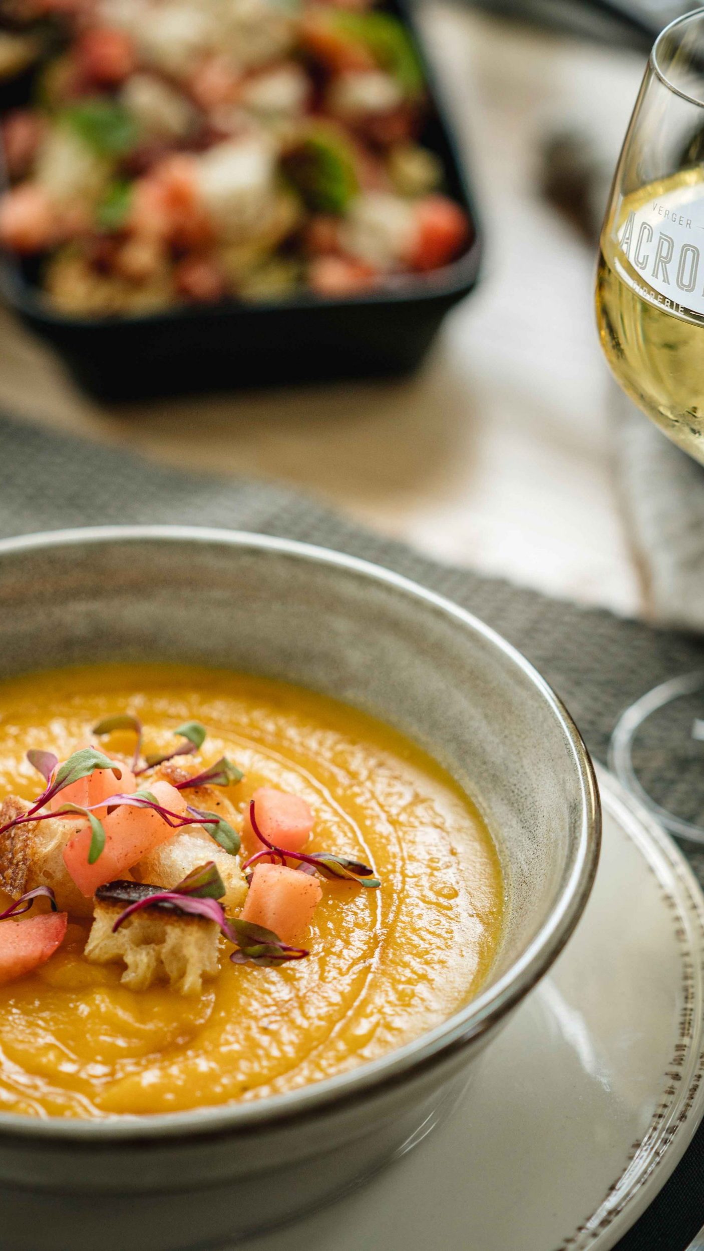 - Côte courte de Bœuf braisé en cuisson lente, légumes racines rôti et écrasé de pommes de terre douces, crotte de fromage et noix de muscade.