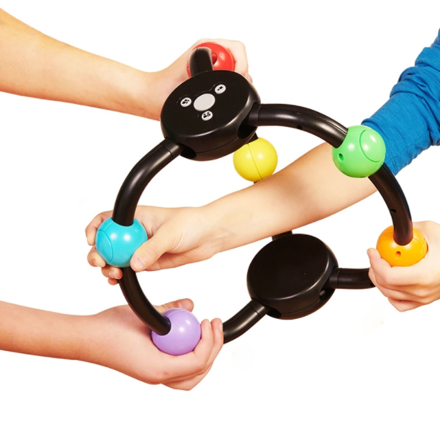 Ce jeu a de quoi rendre les parents fous, mais les enfants heureux! D’ailleurs Bart, Lisa et Maggie ont fait perdre la boule à Marge et Homer avec ce jeu dans un épisode des Simpson. En produisant des sons, il demande aux joueurs d’appuyer, de tenir et de tourner les boules sans le lâcher, donc les mains s’entremêlent. Une sorte de «twister» pour les mains.