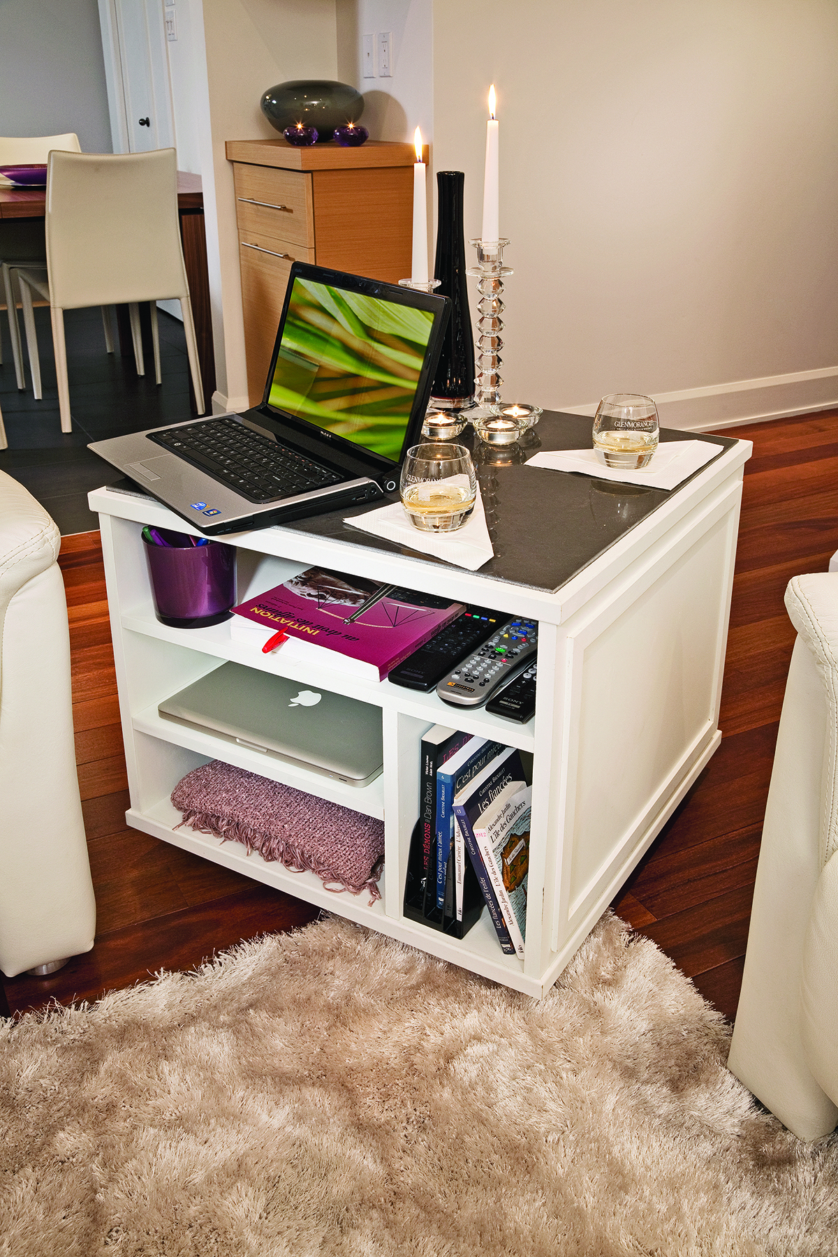 «Conçu pour combler les besoins de rangement et pour offrir une surface d’appoint pratique à l’occasion», le meuble fabriqué en bois est doté de compartiments intérieurs, de roulettes et est surmonté d’un carré de céramique pour en faciliter l’entretien. «Ce meuble d’appoint permet de travailler sur son portable au salon, et ce, calé bien confortablement dans le canapé», peut-on lire dans le magazine.
