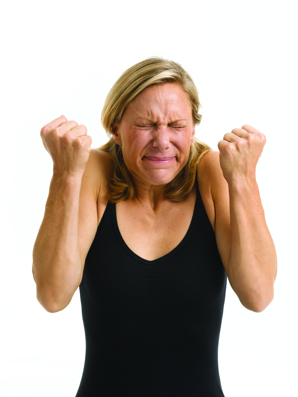 Inspirez par le nez et serrez les poings. Contractez vos fesses et tous vos muscles faciaux. Gardez la pose.