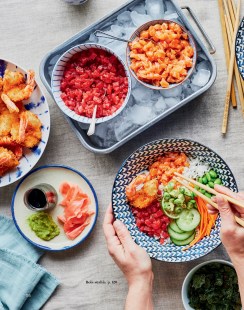 Manger ensemble rassemble 10 formules pour recevoir: les bouchées, le buffet froid, le brunch, les planches apéro, le grand plat à partager, les stations alimentaires pour les gros partys, la table de desserts, le repas pizza, la terrasse (et son barbecue!) ainsi qu’un concept participatif où tout le monde choisit les ingrédients à ajouter tantôt à ses tacos, tantôt à son bol sushi.