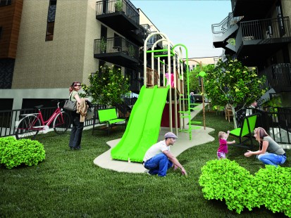 Trouvant que les projets de condos existants à Montréal s’adressaient davantage aux jeunes professionnels «qui souhaitent du luxe», le promoteur Stéphane L’Espérance a pensé les Condos Mont-Joli pour les jeunes familles, avec l’aménagement de deux parcs privés équipés de modules de jeux pour enfants; une première à Montréal.