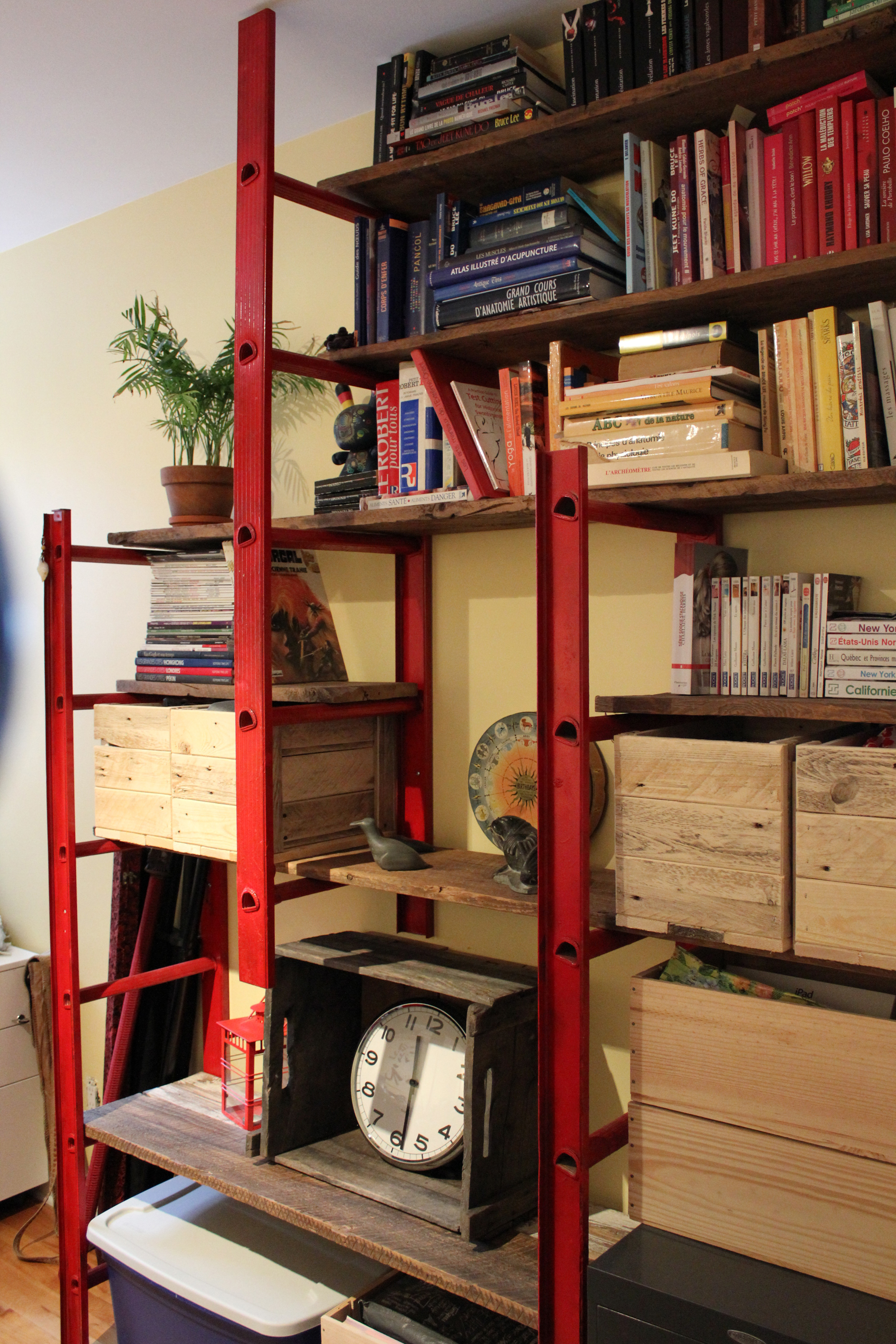 Samuel Michaud est particulièrement fier de la bibliothèque qui meuble son bureau à domicile, «à la fois rangement et élément design», fabriquée à partir d’une échelle qui était devenue dangereuse et de bois de grange récupéré à Weedon, dans les Cantons-de-l’Est. Privilégiant le côté pratique, M. Michaud a pensé à tout : les tablettes interchangeables se modulent au gré de ses besoins, et l’ensemble est même agencé à sa table de travail faite d’une simple porte fixée au mur.