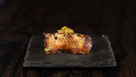 Mentionnons également le thon qui est flambé avec de la sauce soya, de l’ananas et du sucre brun, ce qui lui confère une légère caramélisation, ou celui qui est mariné au saké, grillé, refroidi puis arrosé de ponzu et servi avec des oignons frits. Il y a aussi le saumon, juste assez torché pour faire rôtir le matcha saupoudré sur le dessus et faire ressortir le gras, mais sans cuire le poisson.