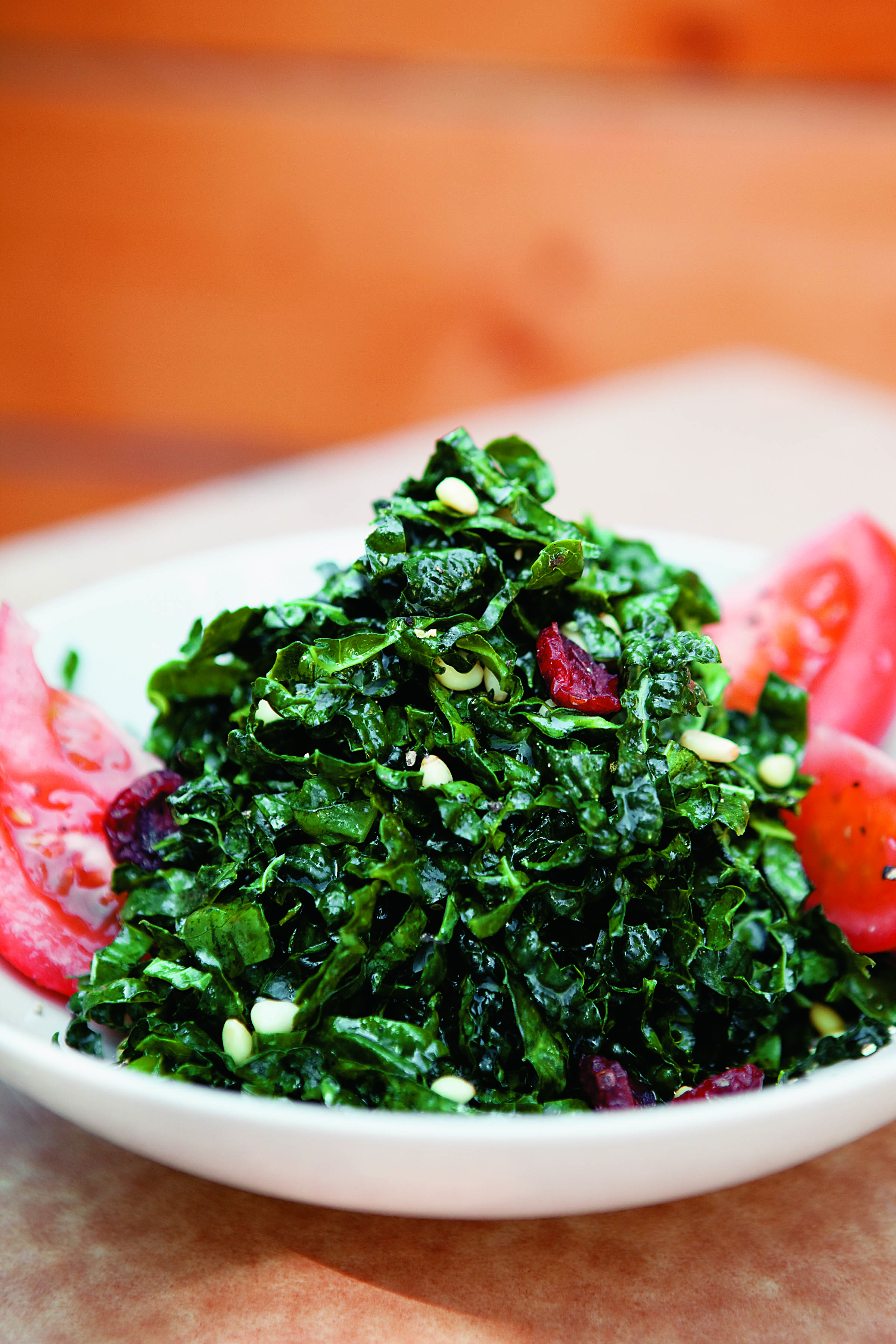 Le chou vert frisé est plus facile à manger lorsqu’on prend le temps de le «masser» avec un peu de sel marin et de jus de citron. Les canneberges atténuent légèrement son amertume, tandis que l’huile de lin lui donne un bon goût de noisette et lui ajoute des acides gras essentiels. On peut remplacer l’huile de lin par de l’huile d’olive additionnelle.