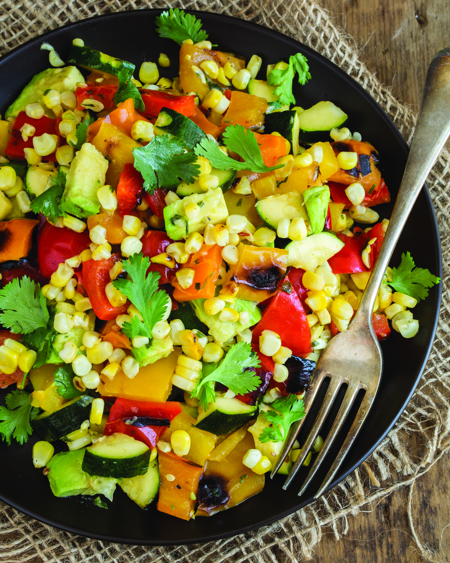 3. Préchauffer le gril à feu moyen durant 10 minutes. Quand le barbecue est prêt, y placer les épis de maïs, les poivrons et les zucchinis (sur la grille du haut) et les retourner toutes les cinq minutes. Cuire les poivrons et les zucchinis de 10 à 15 minutes, ou jusqu’à ce qu’ils soient tendres et légèrement marqués par le gril. Poursuivre la cuisson du maïs de 10 à 15 minutes (de 20 à 30 minutes au total).