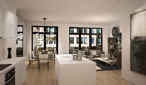 «Pour imaginer le décor des unités, je me suis inspiré du mouvement minimaliste, né en Angleterre. J’ai opté pour des fenêtres noires qui viennent encadrer l’espace, des cuisines blanches, des planchers en érable clair et des salles de bain en pierres gris foncé. Le tout aménagé avec des lignes très pures», explique Carlo Martin.