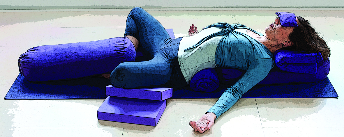 Couché sur un coussin, il faut garder le dessous des pieds ensemble et plier les genoux vers l’extérieur. L’idéal est de soutenir les genoux à l’aide de couvertures. Garder la pose de cinq à dix minutes, en se concentrant sur sa respiration.