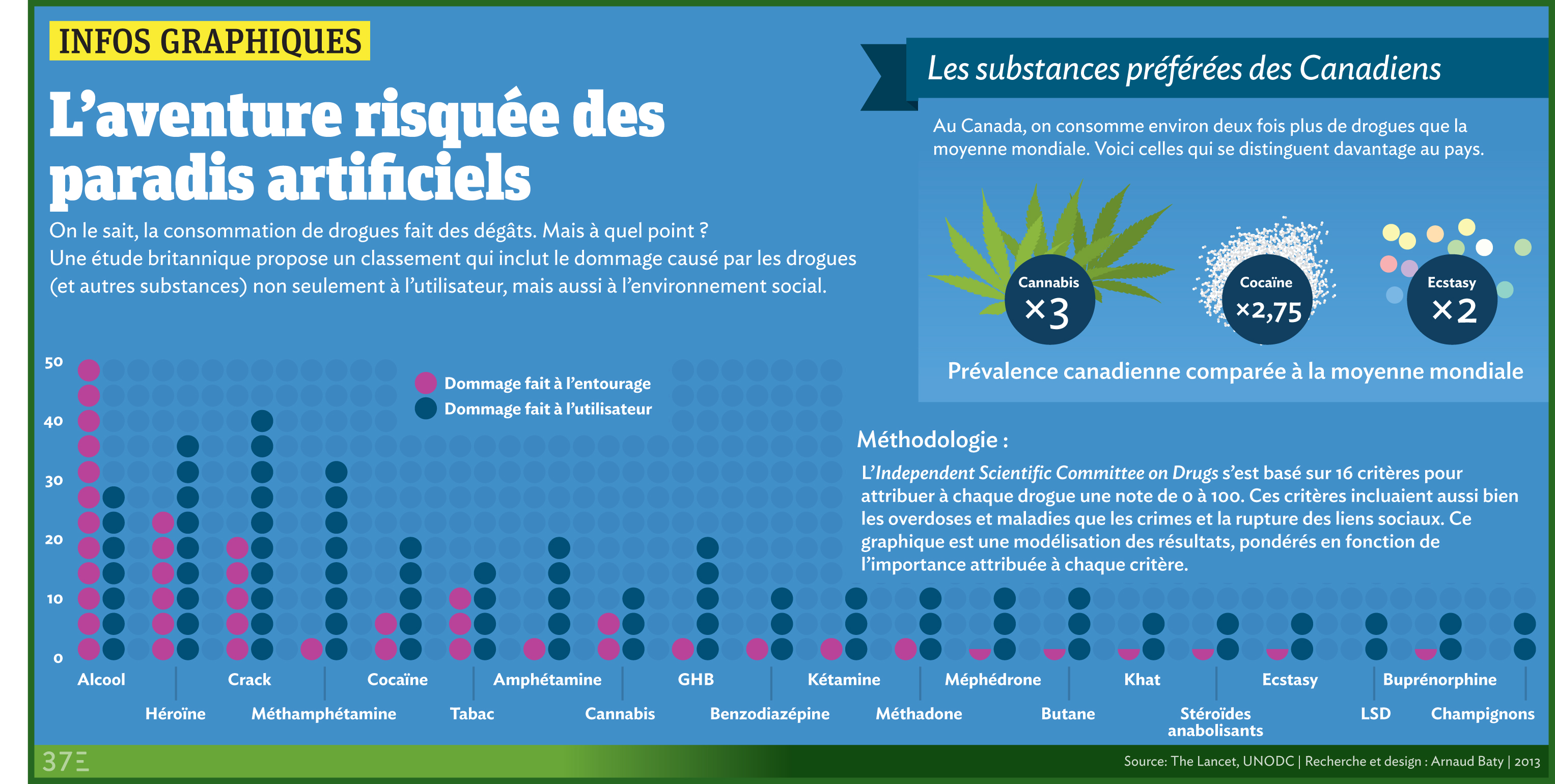 On le sait, la consommation de drogues fait des dégâts. Mais à quel point ? Une étude britannique propose un classement qui inclut le dommage causé par les drogues (et autres substances) non seulement à l’utilisateur, mais aussi à l’environnement social.