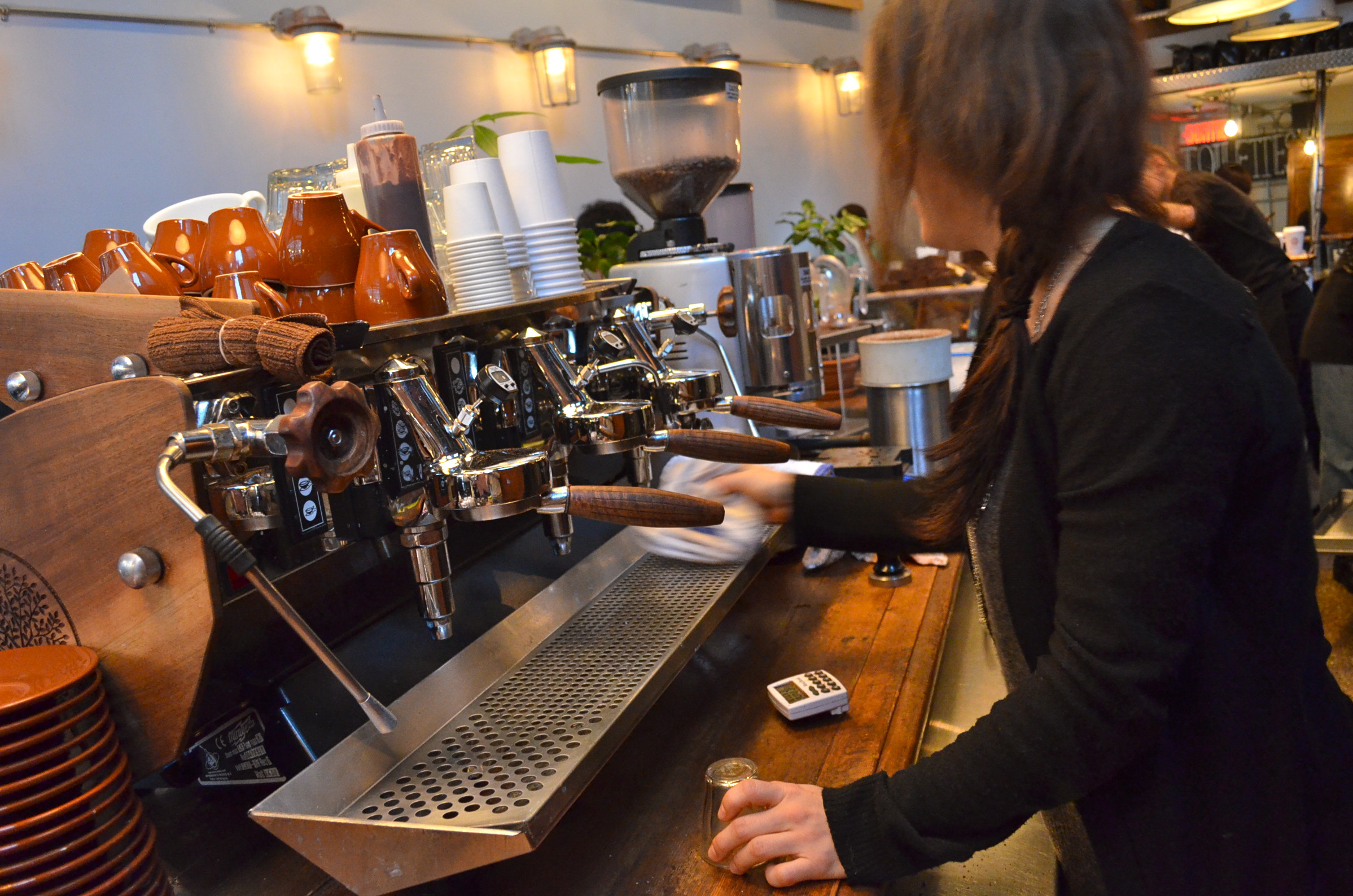 Marie-Ève Laroche vient du milieu des arts. Dans sa tête trottait l’idée d’ouvrir un café depuis un moment. Après avoir fait ses classes, entre autres grâce à un séjour d’un an en Australie, où elle a travaillé dans des cafés et des plantations, la jeune femme ouvre, en 2011, Pikolo, avenue du Parc, qui s’est rapidement imposé auprès des étudiants de McGill et des travailleurs du secteur. Depuis, le café troisième vague a explosé à Montréal. Dans l’étroit local, il règne une ambiance chaleureuse. Avec sa tresse brouillonne qui tombe sur son épaule gauche, Marie-Ève prépare un latte dans un verre, la signature du café. Derrière son comptoir, elle est comme un poisson dans l’eau.