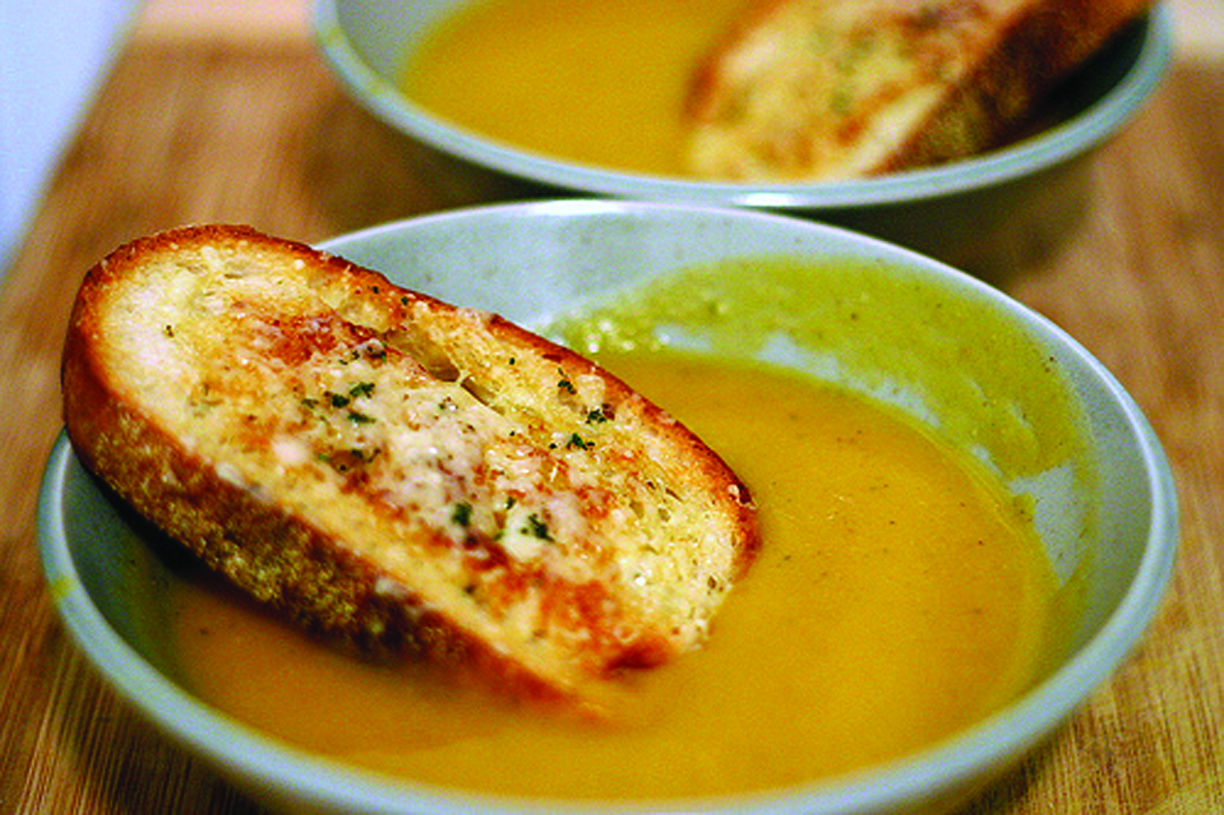 - Croûtons : Beurrer chaque tranche de pain sur un côté. Placer les tranches, côté beurré vers le haut, sur une plaque de cuisson. Passer sous le gril jusqu’à ce que le pain soit doré, environ 1 minute, puis retourner. Saupoudrer de fromage, de thym, de sauge, de sel et de poivre. Griller pendant encore 1 minute, jusqu’à ce que le fromage soit fondu. Verser le potage dans des bols et garnir de croûtons.