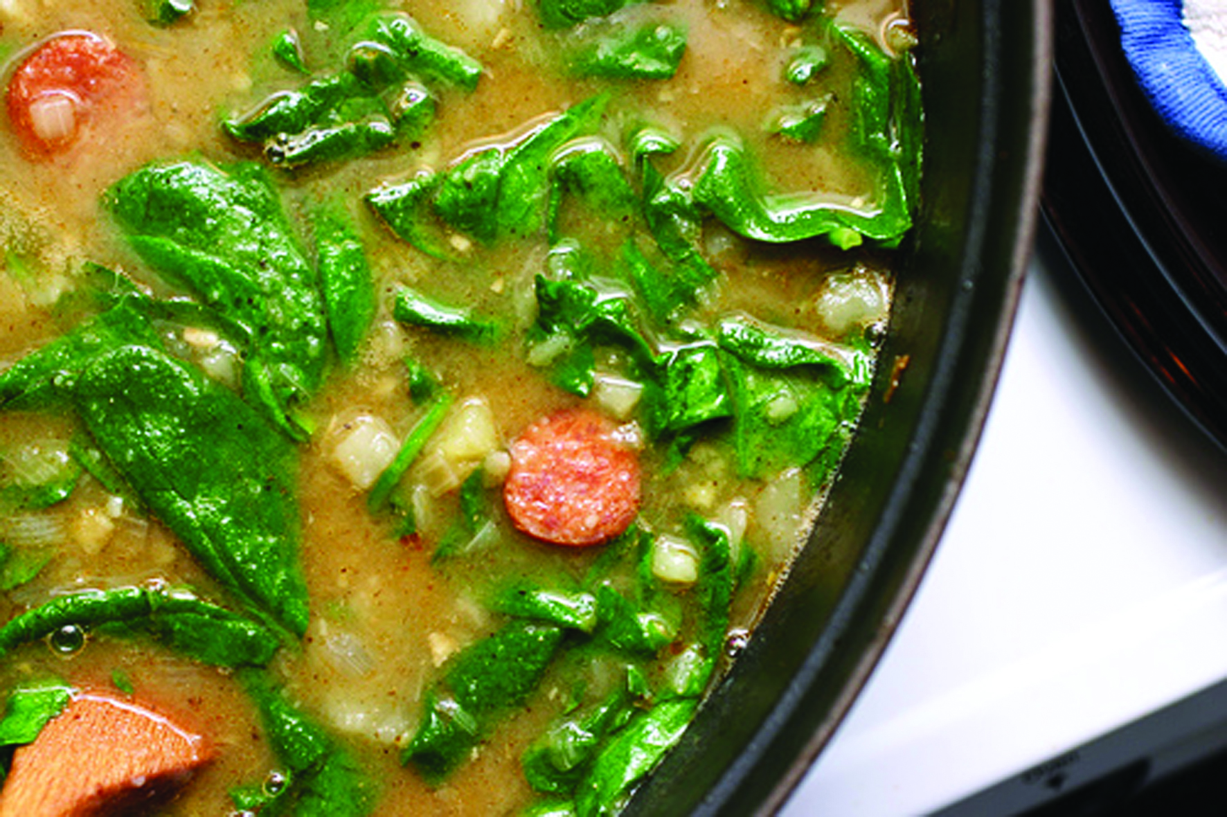 - Verser le bouillon, porter à ébullition et racler le fond de la casserole. Réduire le feu à moyen-doux, couvrir et laisser mijoter jusqu’à ce que les patates soient tendres, en mélangeant de temps en temps, environ 20 minutes. À l’aide d’un pilon, écraser les patates. Ajouter les morceaux de saucisse. Incorporer les épinards et laisser mijoter jusqu’à ce que les feuilles ramollissent, environ 5 minutes. Ajouter l’huile restante et assaisonner au goût.