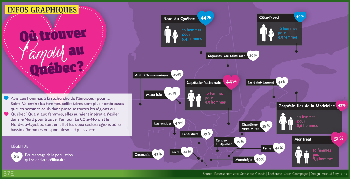 Avis aux hommes à la recherche de l’âme sœur pour la Saint-Valentin : les femmes célibataires sont plus nombreuses que les hommes seuls dans presque toutes les régions du Québec! Quant aux femmes, elles auraient intérêt à s’exiler dans le Nord pour trouver l’amour. La Côte-Nord et le Nord-du-Québec sont en effet les deux seules régions où le bassin d’hommes «disponibles» est plus vaste.