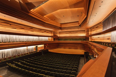 Inauguré le week-end dernier sur le campus de l’Université Queen’s, le nouvel espace culturel de 45 M$ était sur la table à dessin depuis presque six ans, à la suite d’une compétition d’architecture. Un échéancier relativement long pour l’envergure du projet, mais qui aura certainement valu l’attente. Notre arrivée dans l’édifice est marquée par un hall entièrement vitré, offrant un sublime panorama sur le lac Ontario. Des lamelles de bois, récupérées d’un bâtiment qui se trouvait sur le site, viennent compléter l’espace. Une fois plongé dans la salle de spectacle de 566 sièges, on se laisse rapidement séduire par son atmosphère très intime, avec ses chaleureuses strates de bois couleur chocolat.