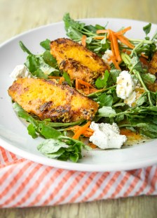 - Pour la salade: Pendant ce temps, dans un bol, mélanger le cresson, l’huile, le vinaigre, les morceaux de fromage de chèvre et les carottes râpées. Saler et poivrer.