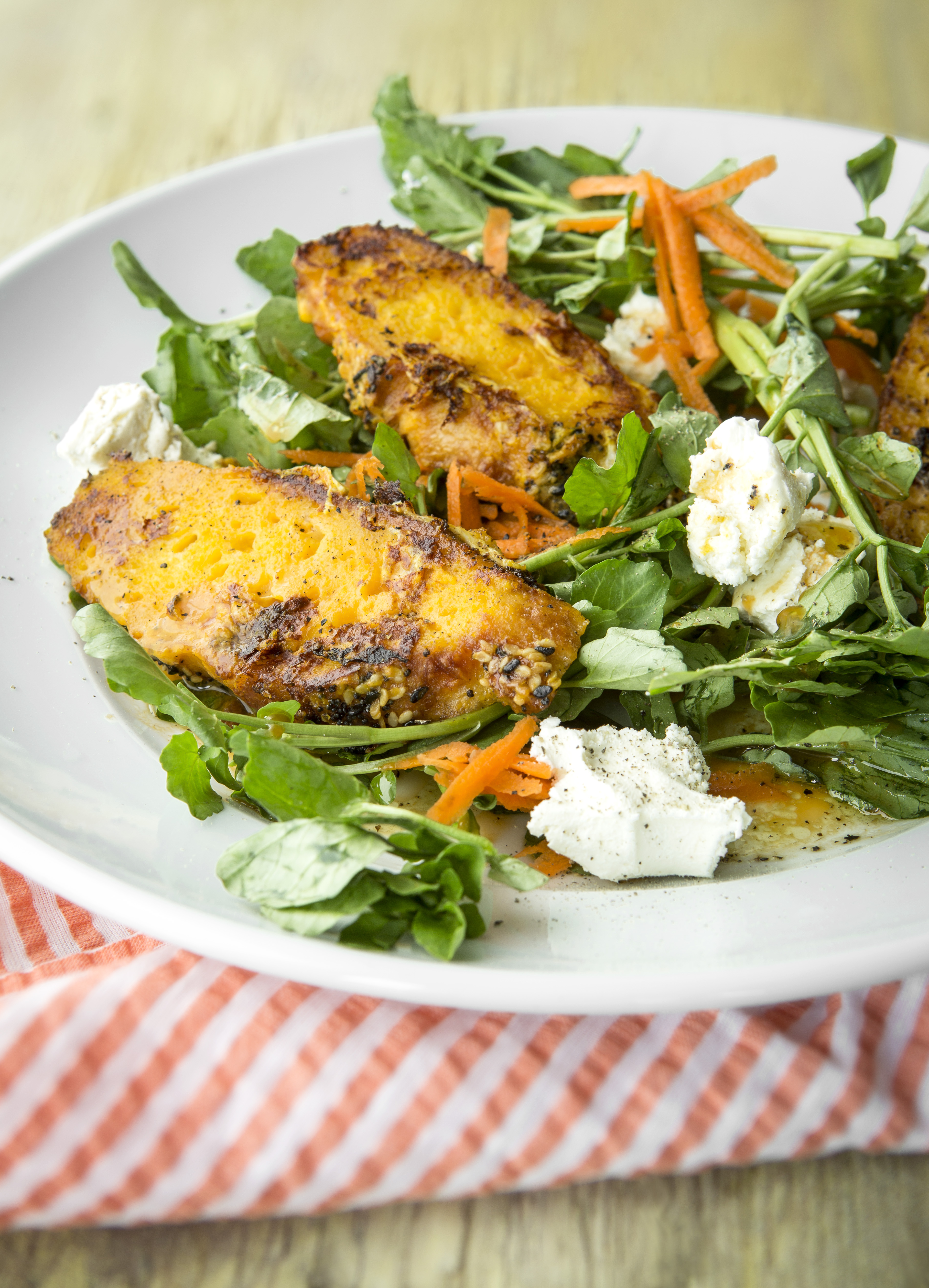 - Pour la salade: Pendant ce temps, dans un bol, mélanger le cresson, l’huile, le vinaigre, les morceaux de fromage de chèvre et les carottes râpées. Saler et poivrer.