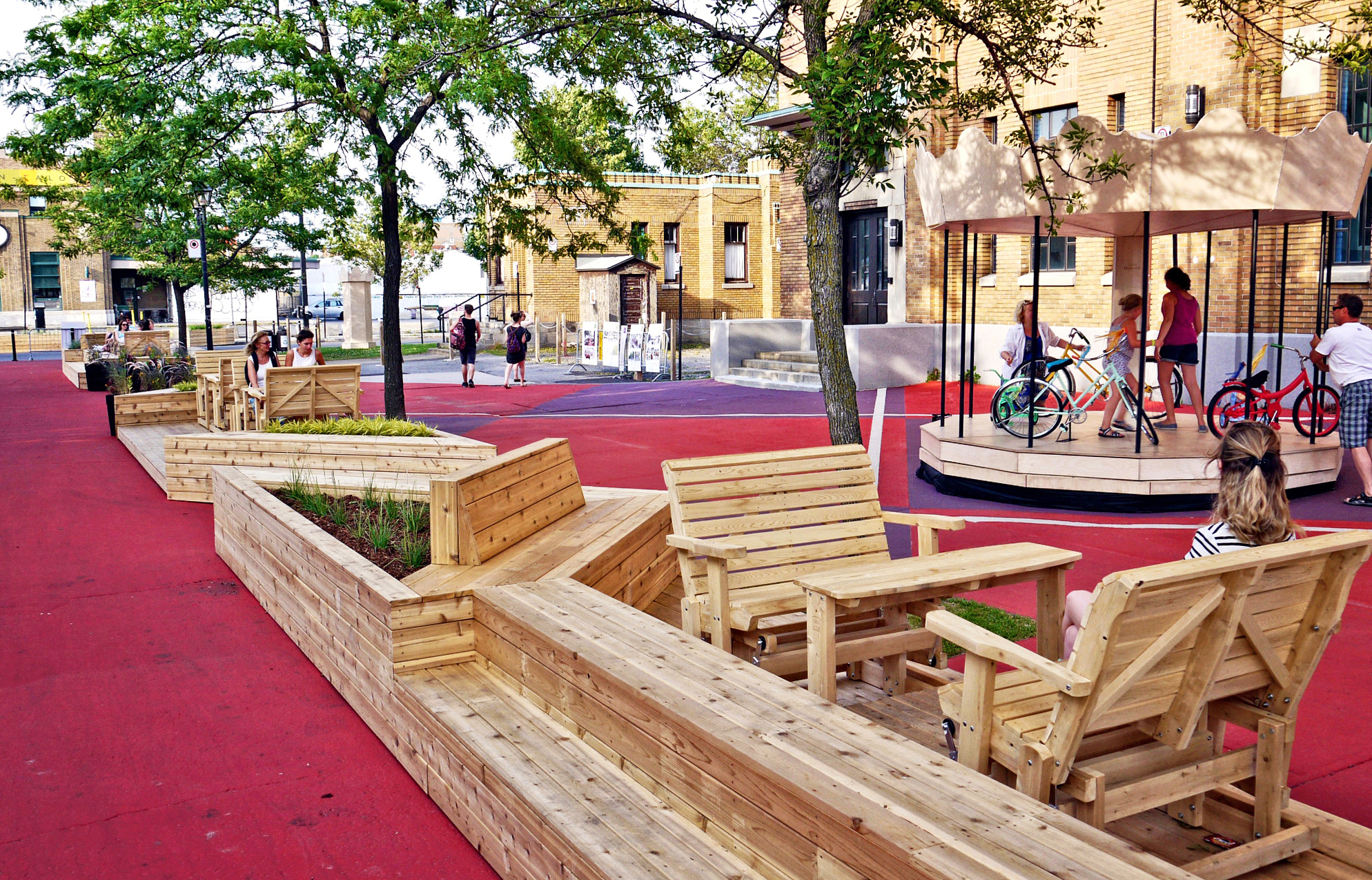 En aménageant la place Shamrock entre le marché Jean-Talon et la rue Saint-Dominique, l’arrondissement de Rosemont-La Petite-Patrie a offert à ses citoyens un nouvel espace de socialisation haut en couleur, et ce, à faible coût (182 000$). Les balancines, les tables bistro et le carrousel ont permis une appropriation spontanée et ludique des lieux, où petits et grands pouvaient facilement y trouver leur compte durant la saison estivale.