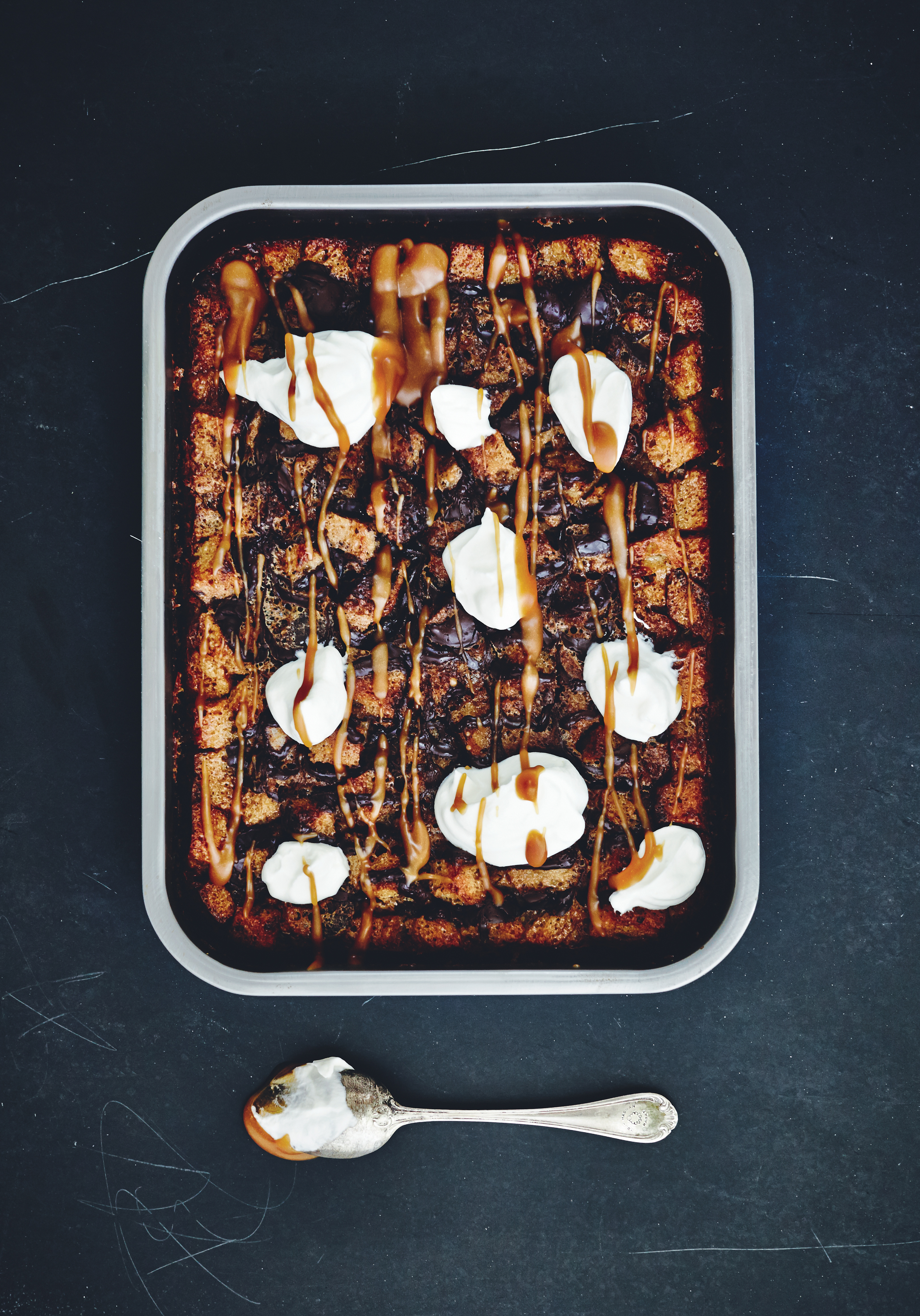 Réchauffez le pudding avant de servir. Répartissez-le dans des assiettes et surmontez chaque part d’une belle grosse cuillerée de sauce au caramel et de crème Chantilly.
