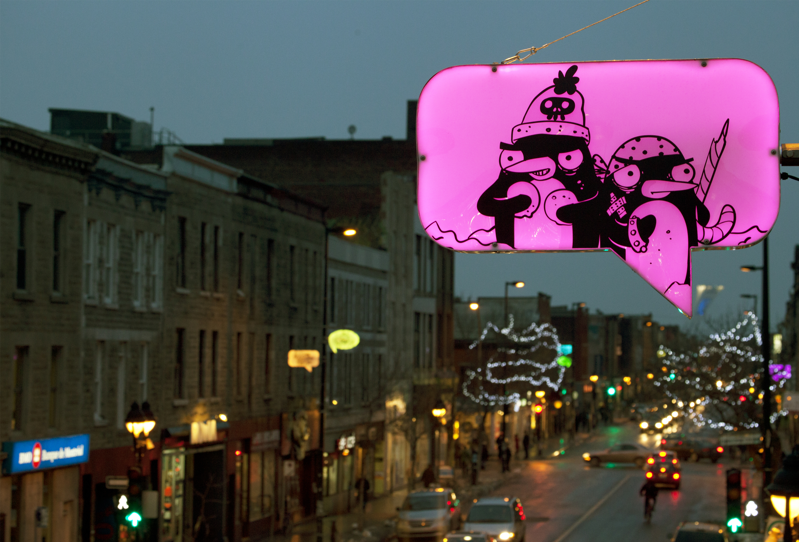 Issue d’un concours de design lancé par la Société de développement de l’Avenue du Mont-Royal, IDÉE-Ô-RAMA est une remarquable réalisation de la firme Turn Me On. Basée sur un concept de bulles de bande-dessinée, l’intervention artistique offre une identité visuelle originale à l’unes des plus importantes artères commerciales du Plateau.