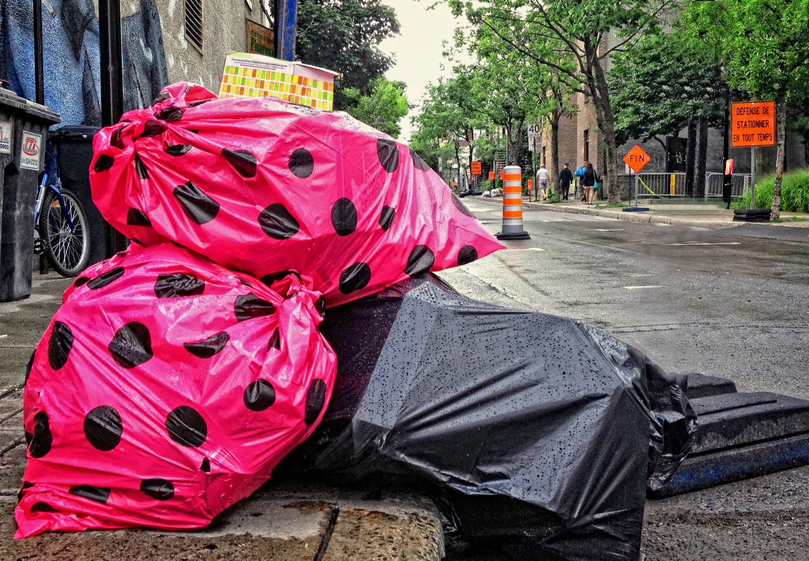 Le projet d’art public TRASH a fait son apparition en sol montréalais l’été dernier dans les rues du Village gai. Initiative de l’artiste new-yorkais Adrian Kondratowicz, l’intervention visait à transformer un élément banal de notre quotidien que l’on tente de cacher, les sacs à ordures, en sculptures colorées. Les commerçants du Village ont ainsi pu troquer leurs traditionnels sacs de plastique noirs pour des sacs roses afin d’embellir l’espace public, tout en le rendant plus ludique.
