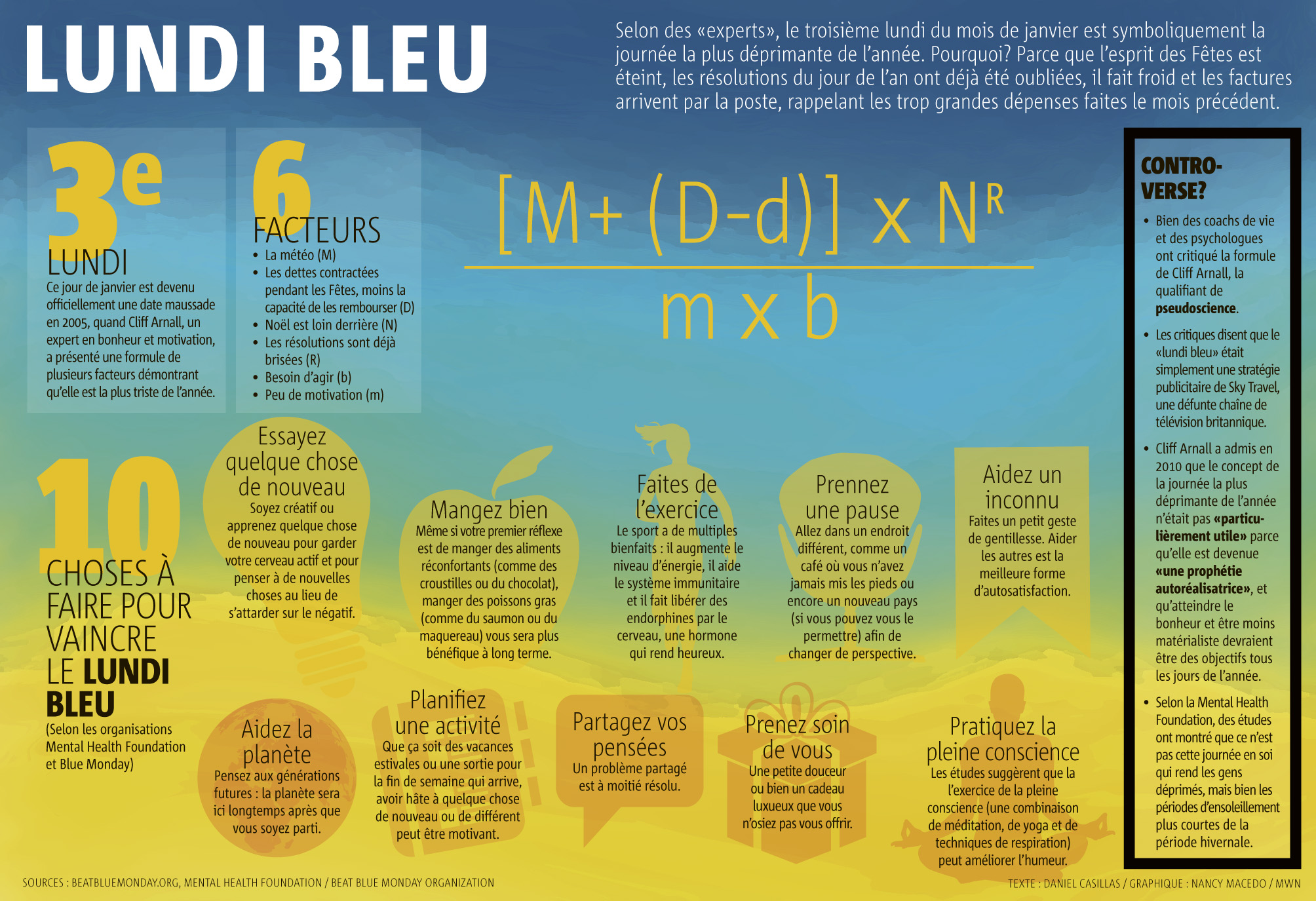 Selon des «experts», le troisième lundi du mois de janvier est symboliquement la journée la plus déprimante de l’année. Pourquoi? Parce que l’esprit des Fêtes est éteint, les résolutions du jour de l’an ont déjà été oubliées, il fait froid et les factures arrivent par la poste, rappelant les trop grandes dépenses faites le mois précédent.