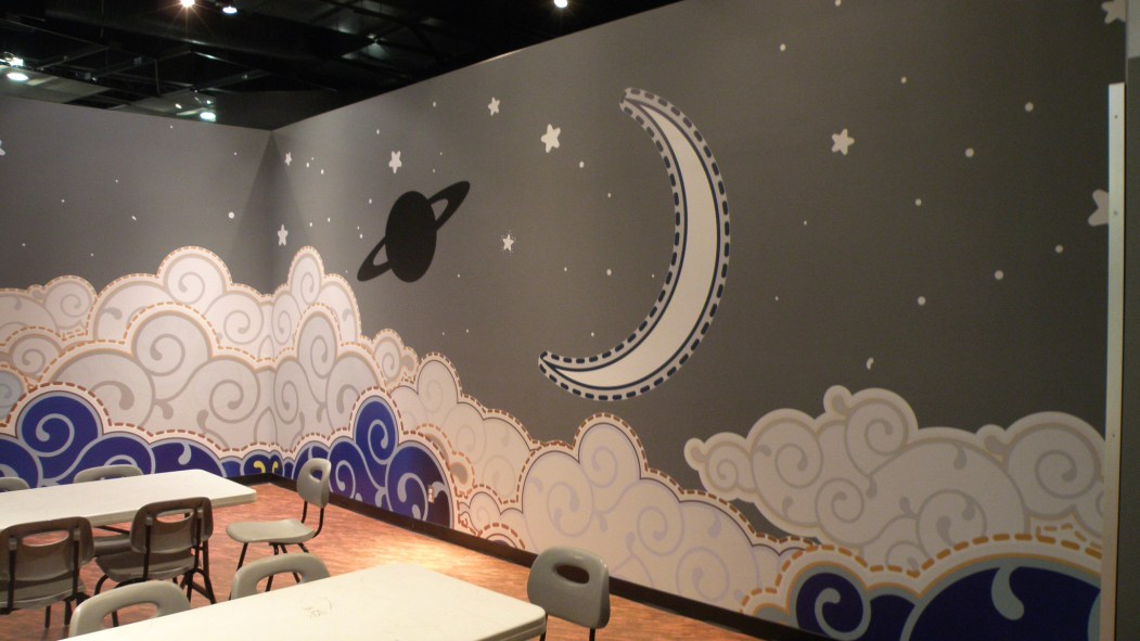 La salle de réception du Cosmodôme de Laval s’est refait une beauté, grâce à une murale réalisée par ADzif, une boîte montréalaise qui a fait sa marque dans la production d’autocollants décoratifs.