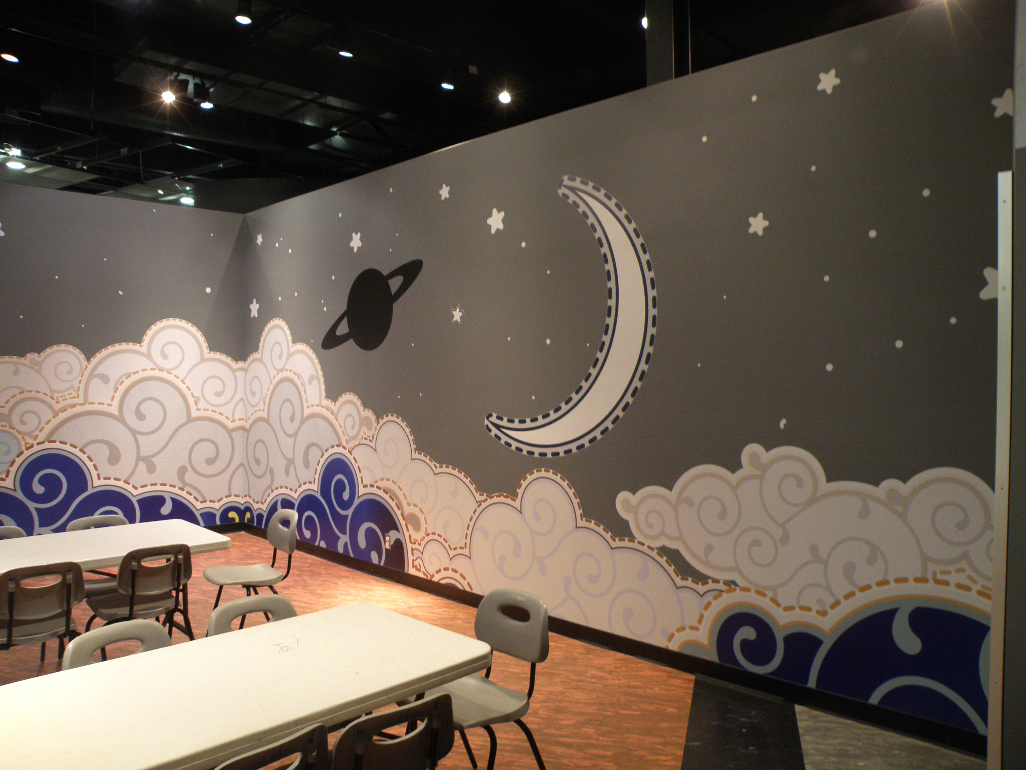 La salle de réception du Cosmodôme de Laval s’est refait une beauté, grâce à une murale réalisée par ADzif, une boîte montréalaise qui a fait sa marque dans la production d’autocollants décoratifs.