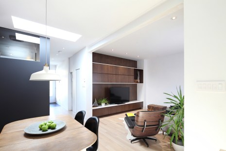 Par ailleurs, ce n’est pas un hasard si les concepteurs du projet ont opté pour une coloration foncée dans la salle de bain. «Nous voulions que les espaces de vie soient à l’avant-scène et que les espaces plus fonctionnels demeurent en coulisse. Le ruban noir qui traverse l’appartement sert en fait à délimiter les un des autres», précise M. St-Onge.