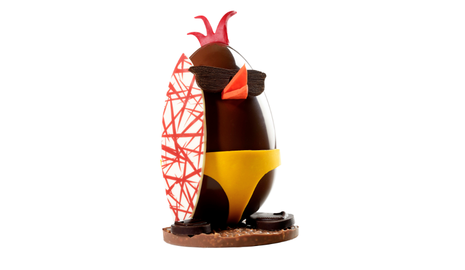 Christophe Roussel: Le chocolatier français Christophe Roussel s’est amusé à concevoir un adorable œuf-surfeur stylisé avec sa planche sous le bras et des solaires vissées sur le nez, sans oublier son maillot de bain… ©Patrick Gerard/Christophe Roussel/AFP Relaxnews