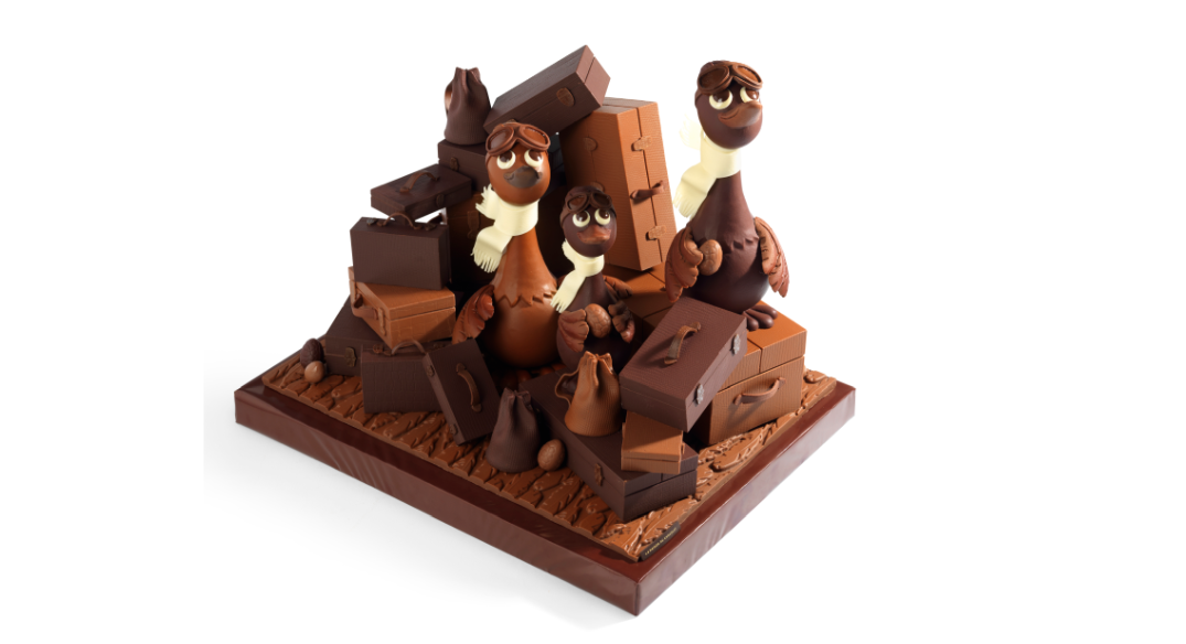 La Maison du Chocolat Nicolas Cloiseau, meilleur ouvrier de France chocolatier, a créé une famille d’oies voyageuses, en partenariat avec la marque française de bagages Moynat. Cette pièce pèse 5 kg et coûte 950€. ©La Maison du Chocolat/AFP Relaxnews