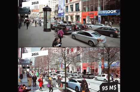C’est à peu près ce qu’a fait l’administration Coderre avec son plan de réaménagement de la rue Sainte-Catherine, qui se résume à la mettre au goût du jour. On élargira les trottoirs de façon permanente sur à peine 300 mètres. On verdira avec quelques arbres ici et là. On ajoutera du mobilier urbain entre les boutiques et les places de stationnement. Le minimum, quoi! Ah oui, il y aura également un accès au réseau Wi-Fi.