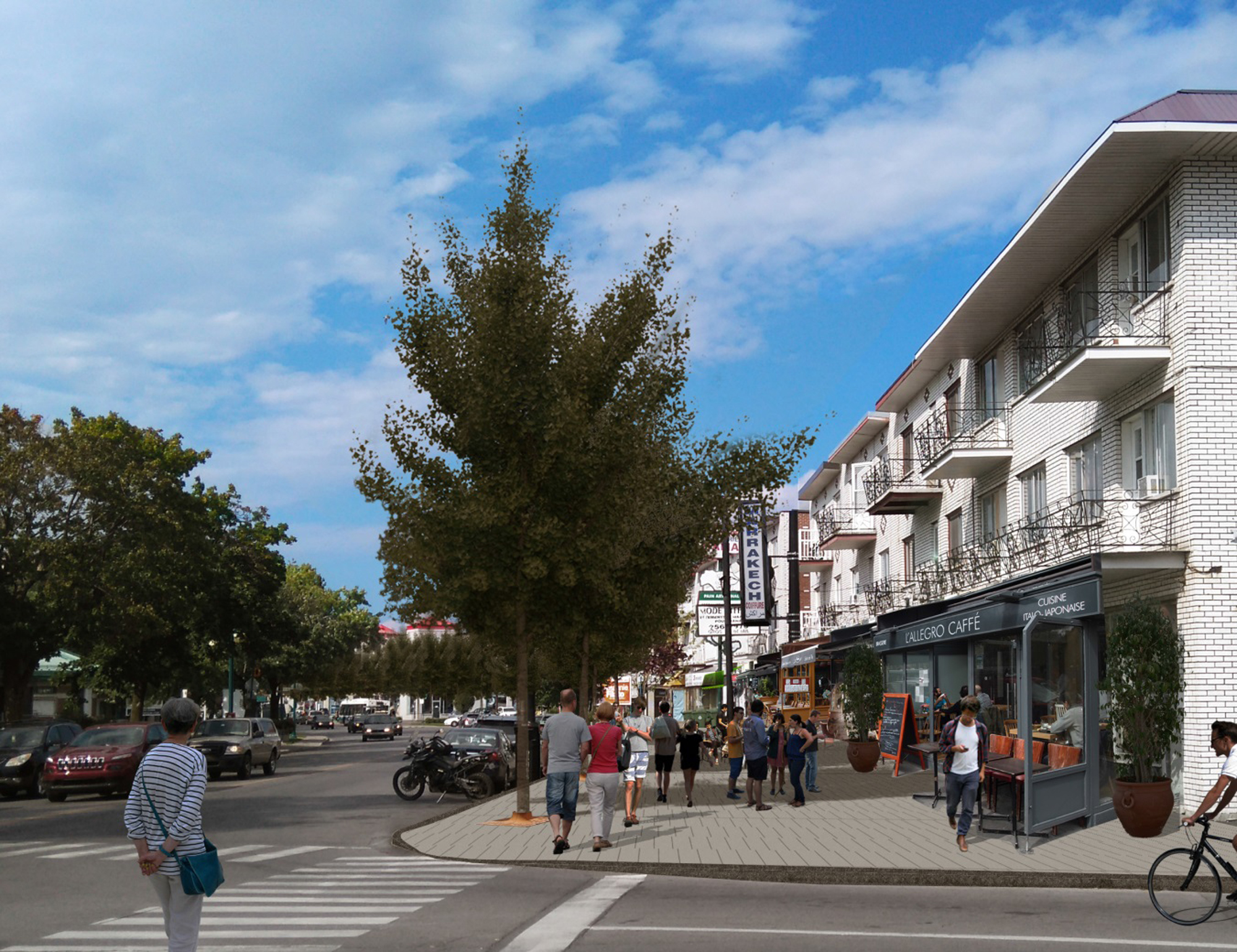 Et que dire de ses «mosaïques» d’asphalte et de pavé uni de trois ou quatre mètres de large, faisant grossièrement le lien entre le trottoir et les façades commerciales? Quelques restaurants y ont vu l’occasion d’aménager des terrasses, mais pour les autres, c’est un espace tristement oublié où pousse la mauvaise herbe.