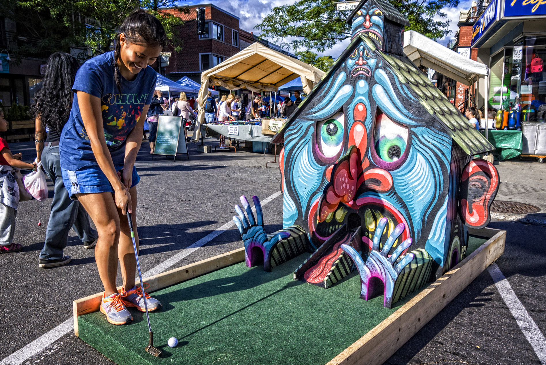 Entreprendre une partie de mini-golf sur l’Avenue du Mont-Royal: c’est ce que nous a permis de faire l’événement Nuit Blanche sur Tableau Noir et Massiv’art en août dernier.