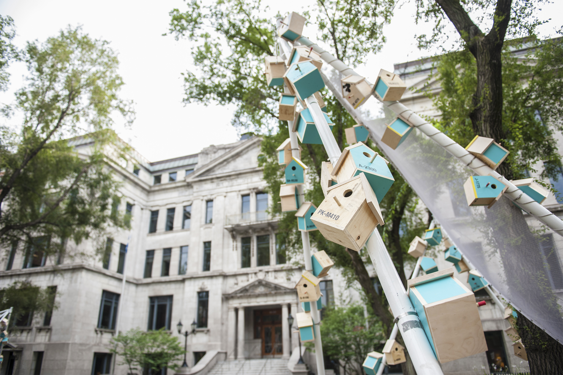 La place Pasteur de l’Université du Québec à Montréal a accueilli l’automne dernier une œuvre artistique ludique, constituée d’une centaine de cabanes d’oiseaux.