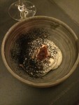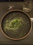 Sur le menu, trois mots à peine décrivent chaque plat. Premier plat: céleri, truite, foin. Intrigant. L’assiette est constituée de truite qu’on a fumée avec du foin et qu’on a recouverte d’une mousse de céleri-rave immaculée, de peau de truite croustillante et brillante, de cendre de foin noire et d’œufs de poisson. C’est léger, tout en contraste et très goûteux; une belle entrée en matière.
