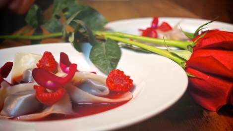 9. Faire cuire 3-4 minutes dans de l’eau frémissante et servir aussitôt avec le bouillon cerise et porto.