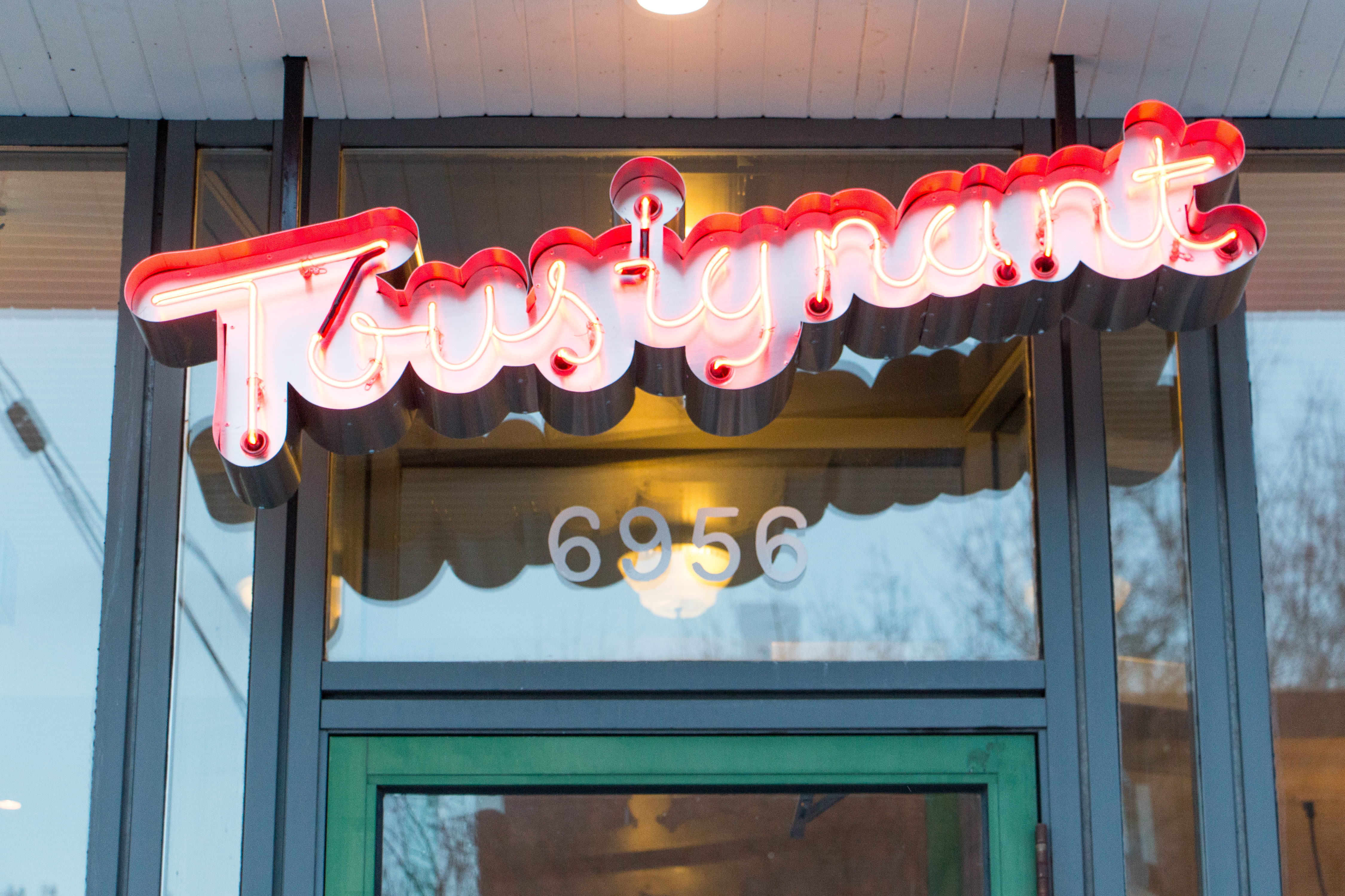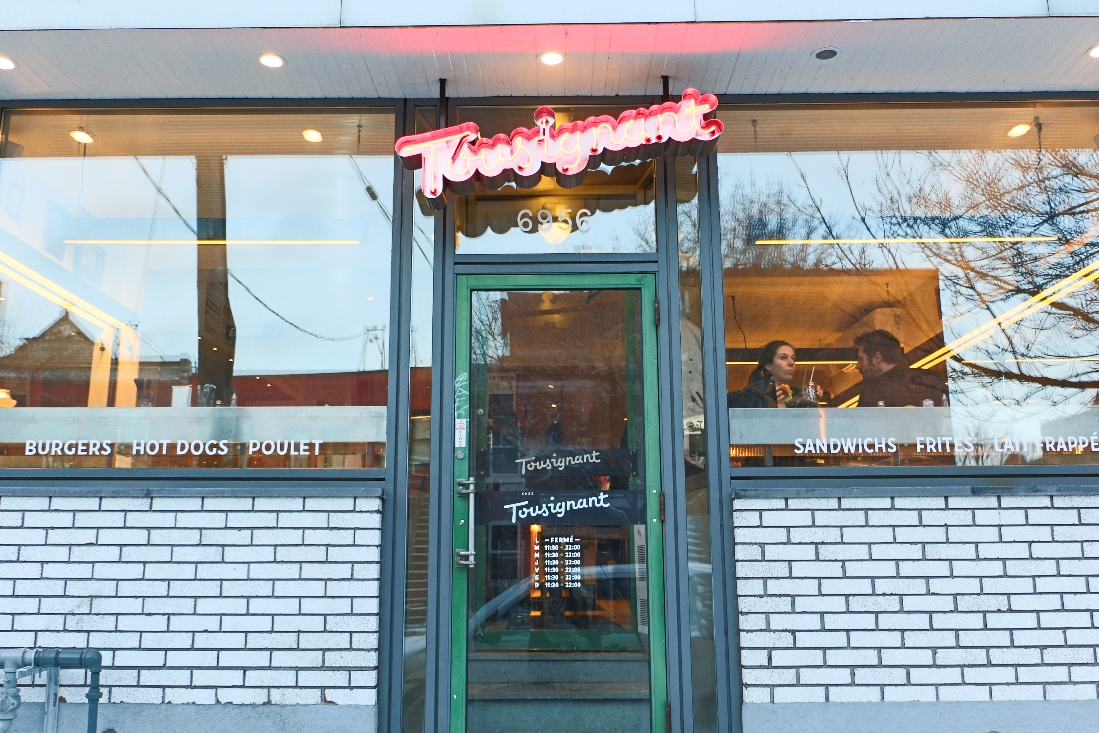 Tout d’abord, il y a le décor de ce casse-croûte de 32 places, situé dans la Petite Italie, qui séduit. Dehors, l’enseigne au néon indiquant Chez Tousignant – le nom de jeune fille de la mère de Yann Turcotte, copropriétaire avec Stefano Faita et Michele Forgione – et les grandes fenêtres dévoilant les clients juchés sur leur tabouret, derrières les comptoirs, sont tout à fait sympathiques.