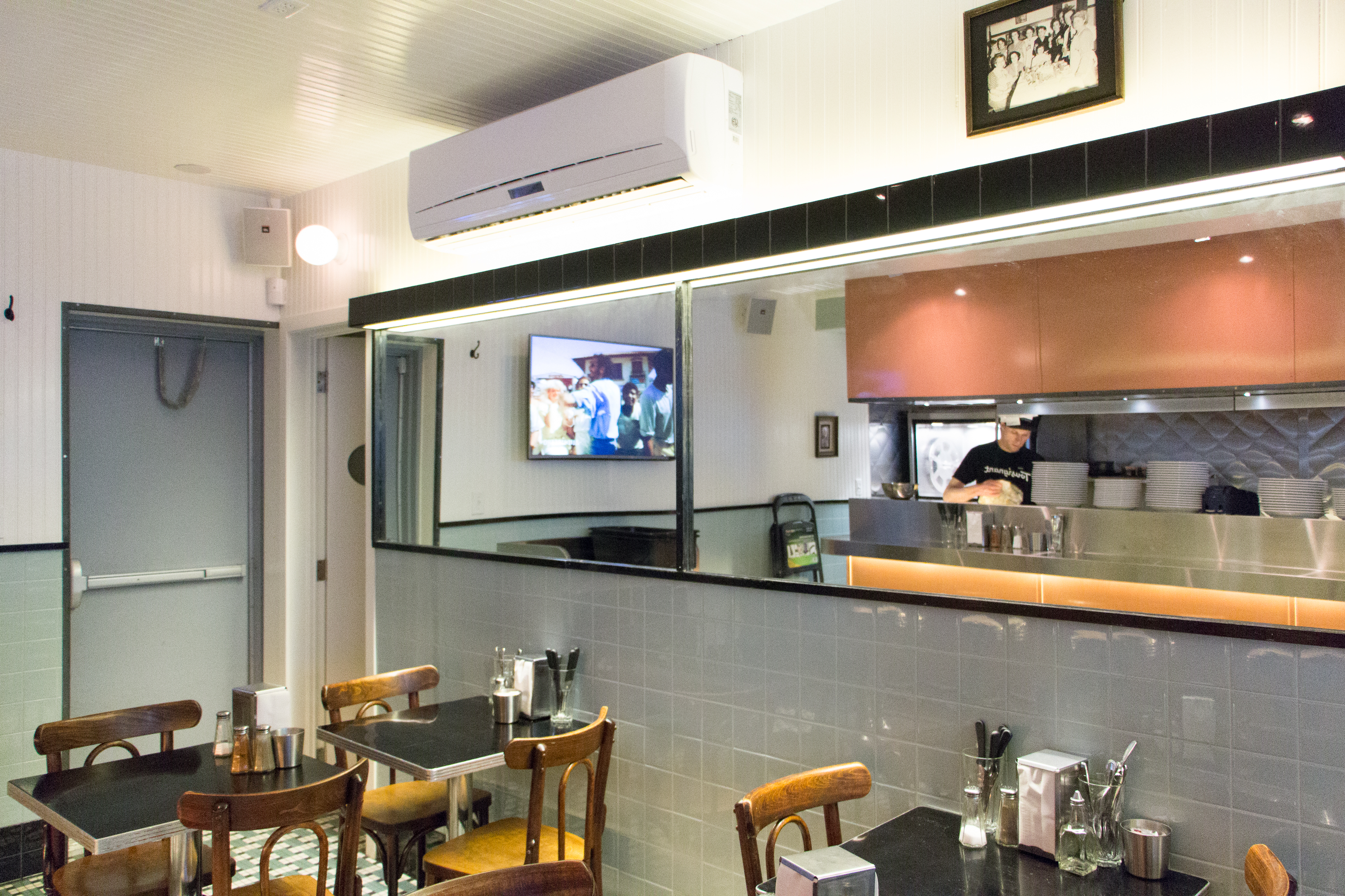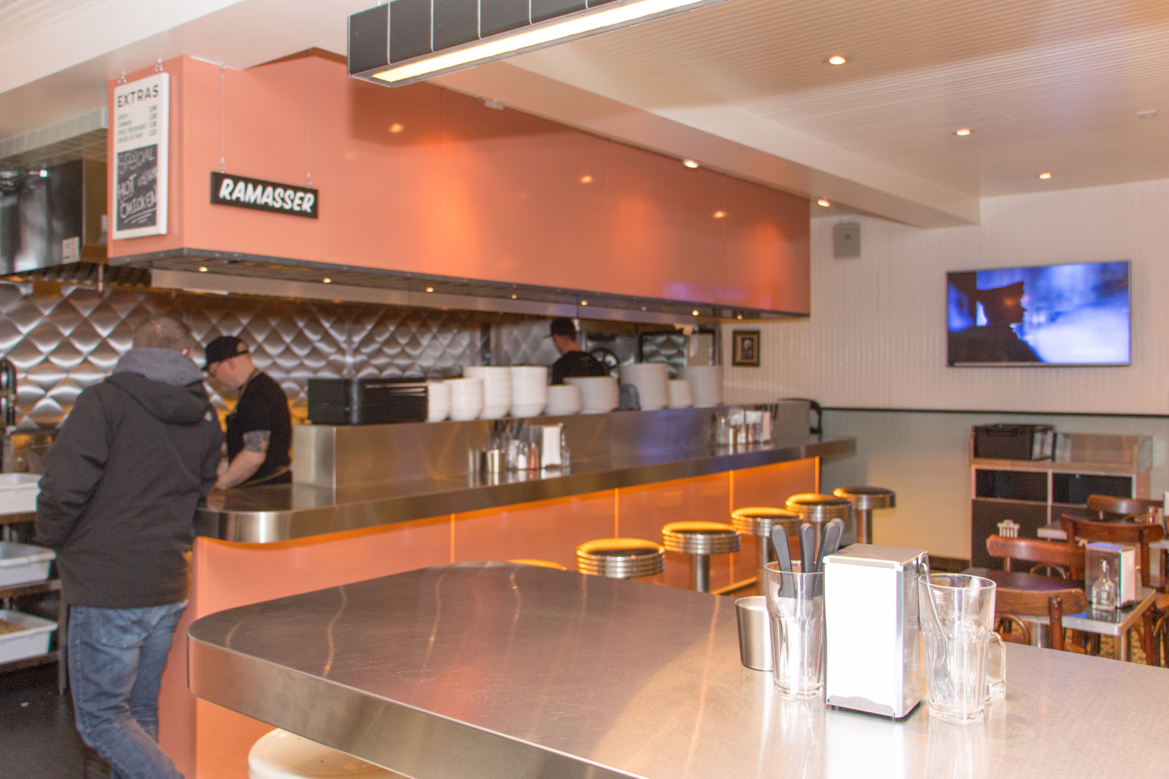 À l’intérieur, on pourrait croire que le réputé designer Zébulon Perron a laissé tomber son style habituel pour recréer, pour notre plus grand plaisir, un véritable diner des années 1950 ou 1960. Mais on remarque rapidement quelques lignes plus contemporaines ici et là. Par exemple, des structures noires viennent couvrir les néons au-dessus des grandes tables à partager en stainless, ce qui nous prouve que nous sommes bien dans les années 2000.