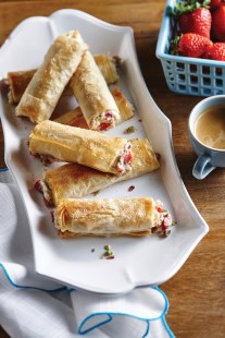 Les fraises du Québec commencent à arriver sur les étals. Pour profiter à fond de la saison de ces petits fruits rouges, voici une recette de Rouleaux impériaux à la fraise, au fromage de chèvre, aux pistaches et au miel issue du livre Mangez Québec!