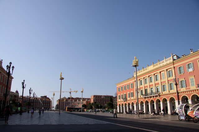 En plein cœur de Nice, la place Masséna est au carrefour de plusieurs rues commerciales. Le sol est en damier, ce qui crée de jolis effets contrastants avec les bâtiments roses et jaunes. Pour faire de meilleures photos, arrivez tôt le matin, ou très tard le soir, avec un trépied.