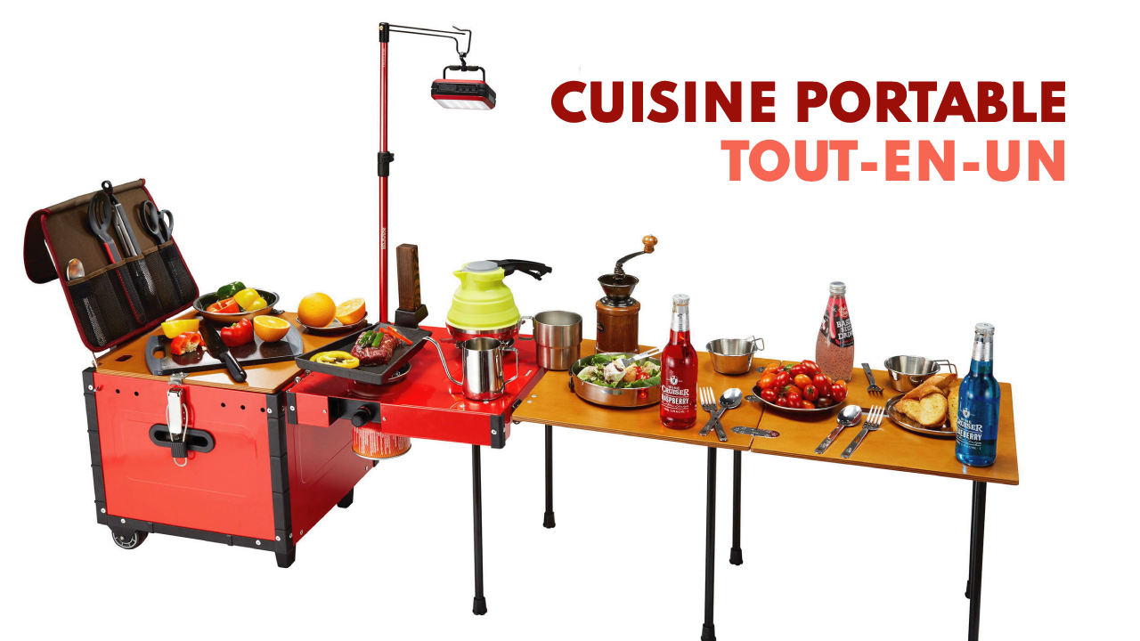 Tout ce dont vous avez besoin pour faire à manger, table, poêles, ustensiles, nourriture et boissons, tient dans la boîte en aluminium léger et thermolaqué.