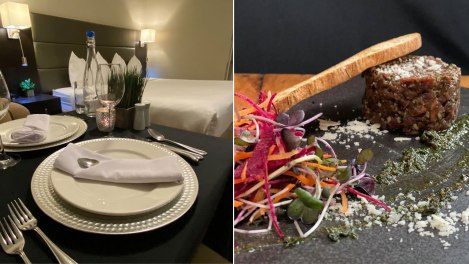 Le concept ressemble au nouveau type de service auquel on a été habitué dans les derniers mois : on nous sert avec le masque et la visière, la bouteille de vin est placée sur la table, mais c’est à nous de faire le service du vin, etc.